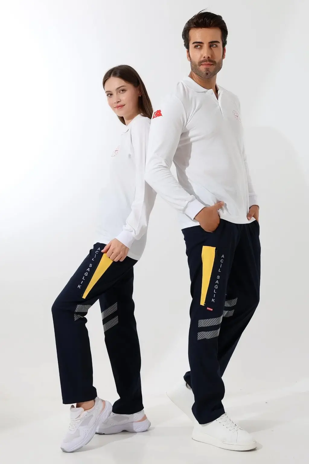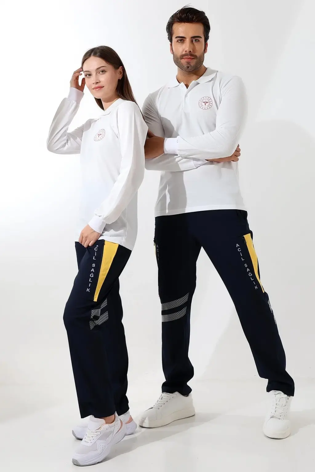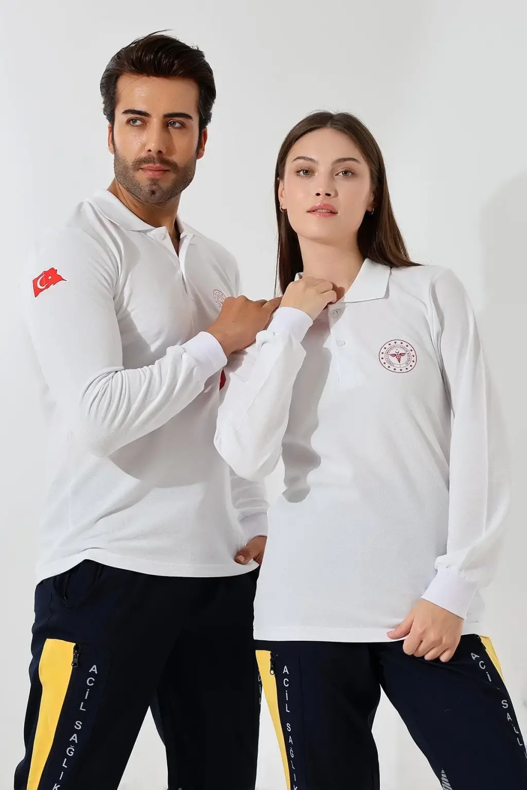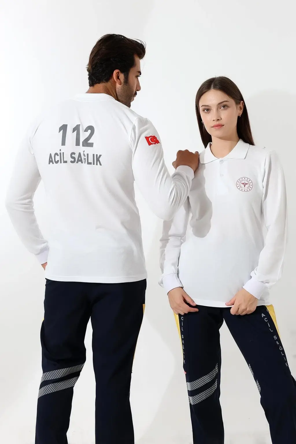 112 Acil Sağlık Yakalı Tshirt Uzun Kol Baskılı - Beyaz