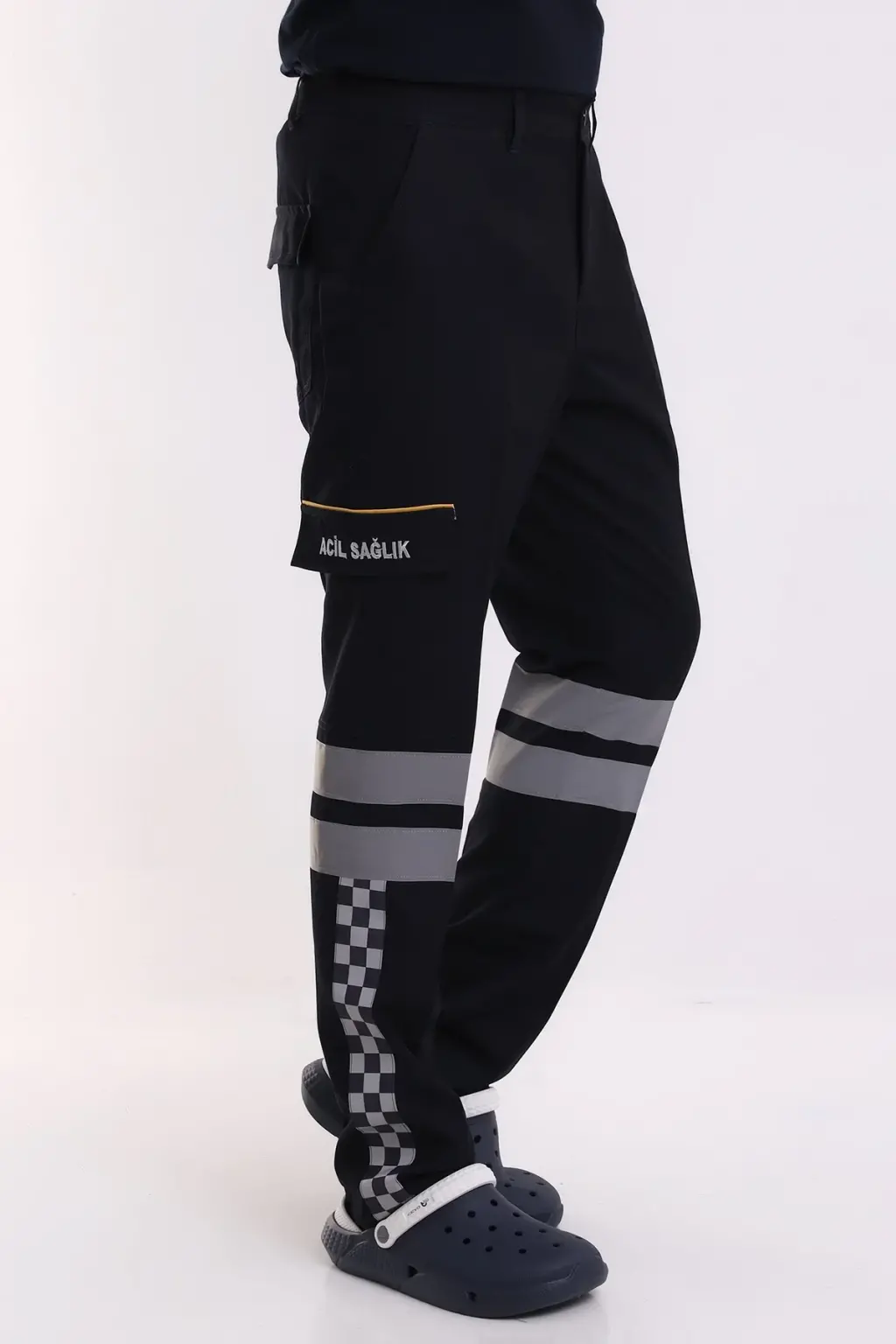 • Paçalarda 5 er cm lik iki sıra yüksek yansıtıcı özellikli reflektif şerit bulunmaktadır.Ayrıca sağ ve sol yanda dizden aşağıya damalı reflektif şeritler mevcuttur.