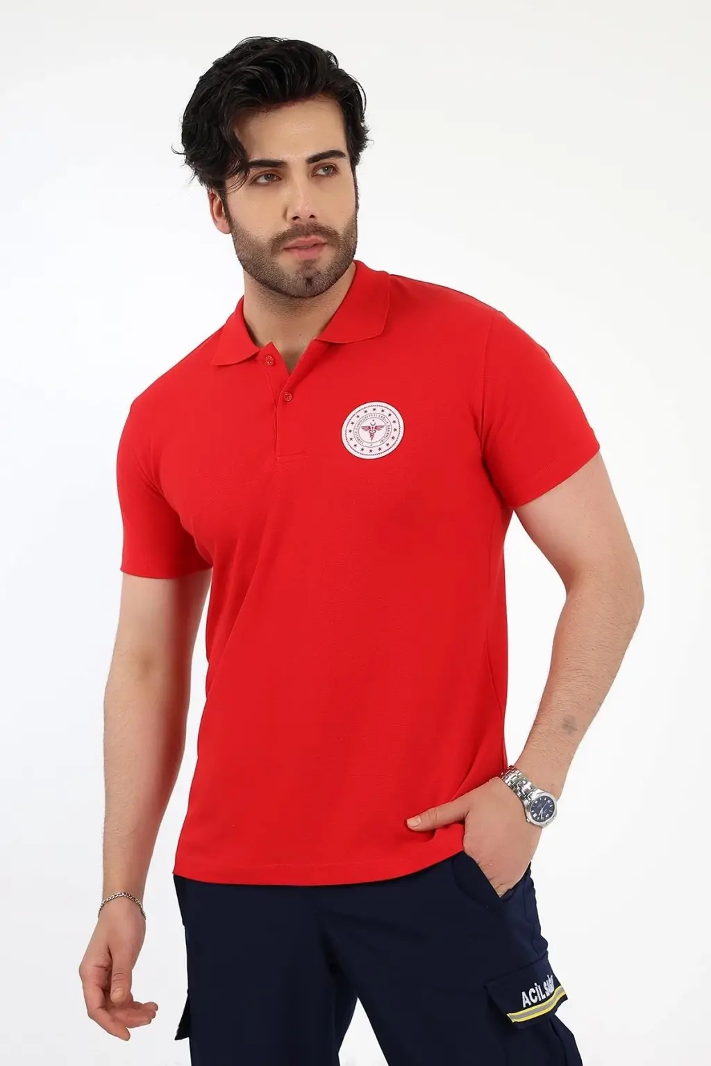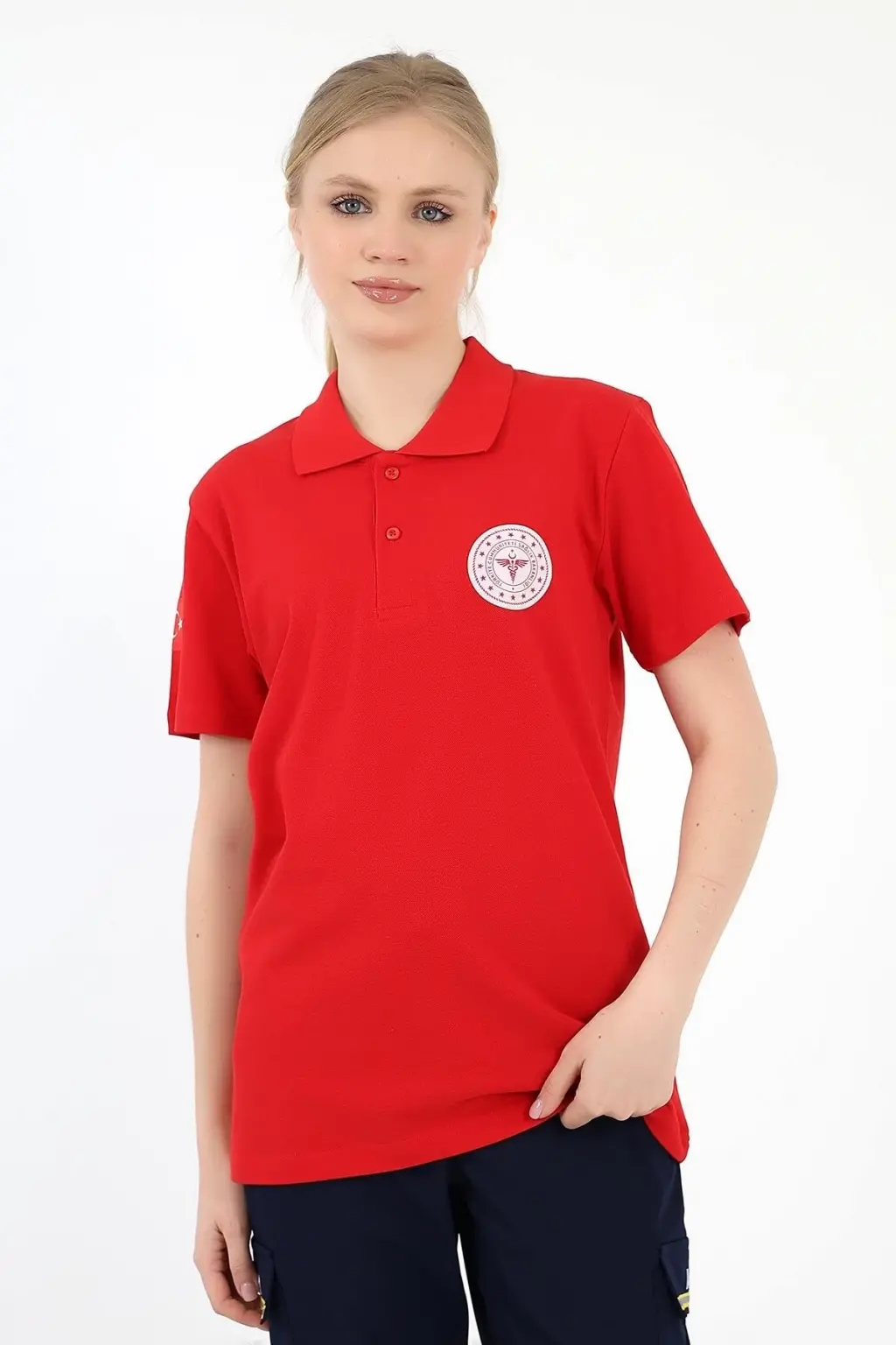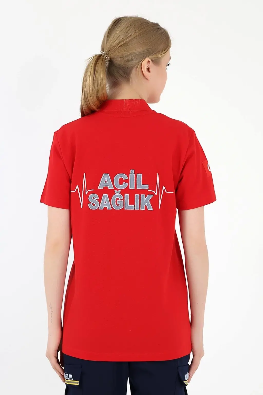 Acil Sağlık Yakalı Tshirt Kısa Kol Nakışlı - Kırmızı