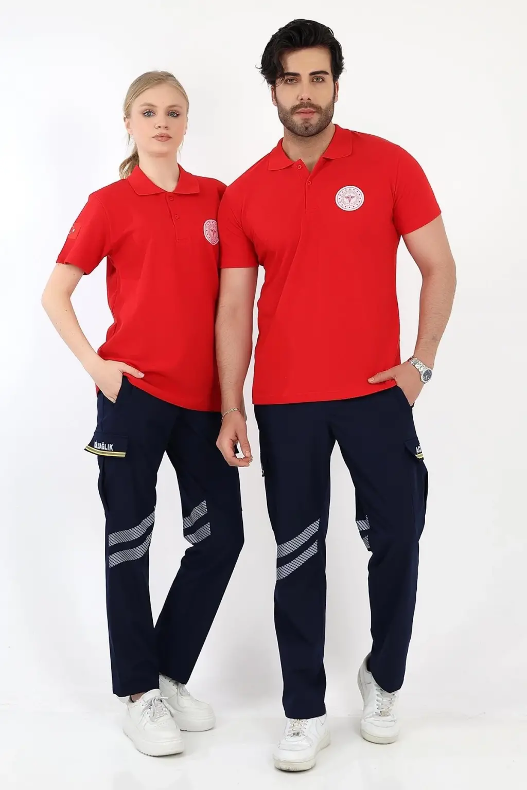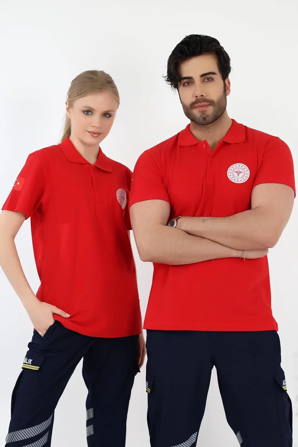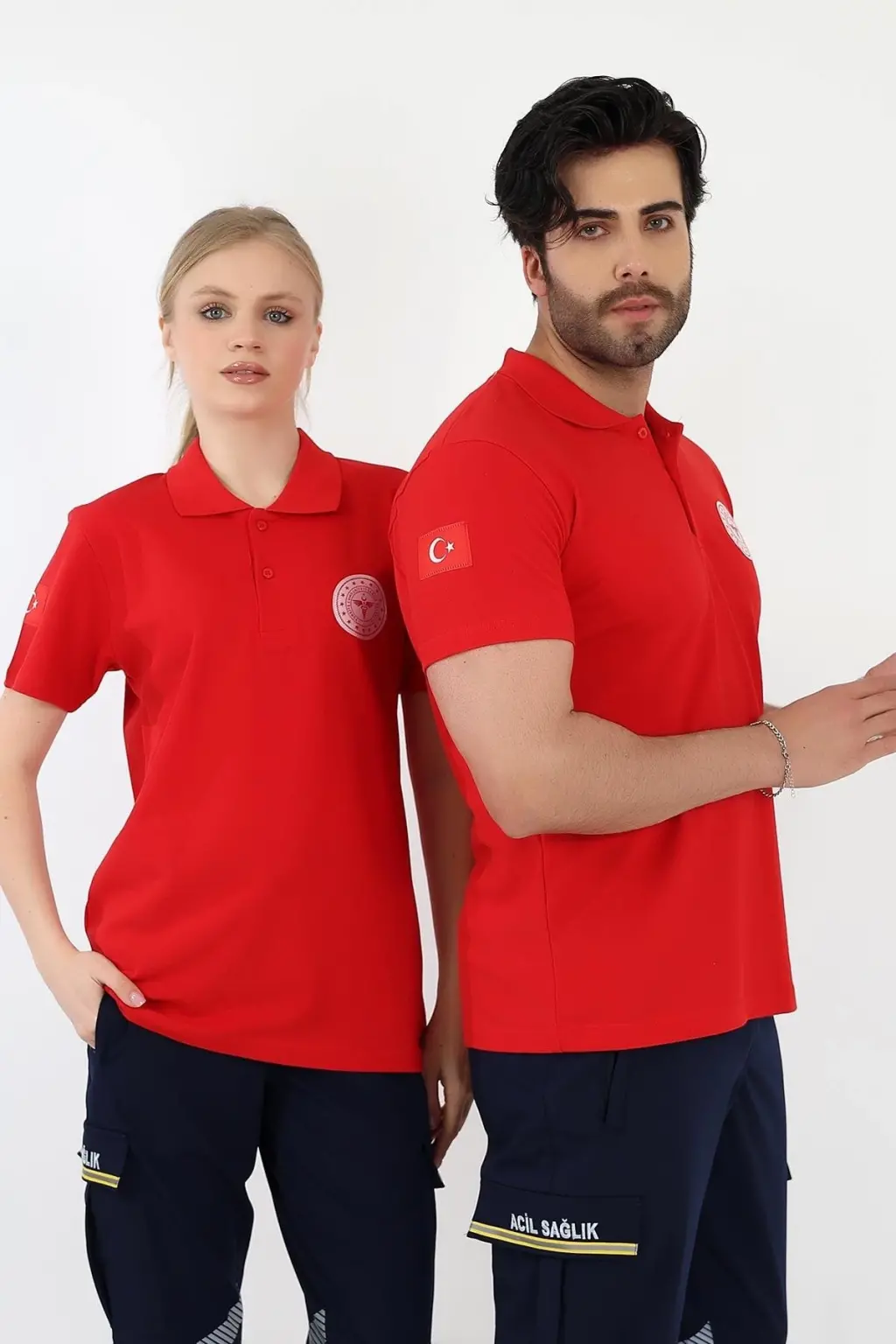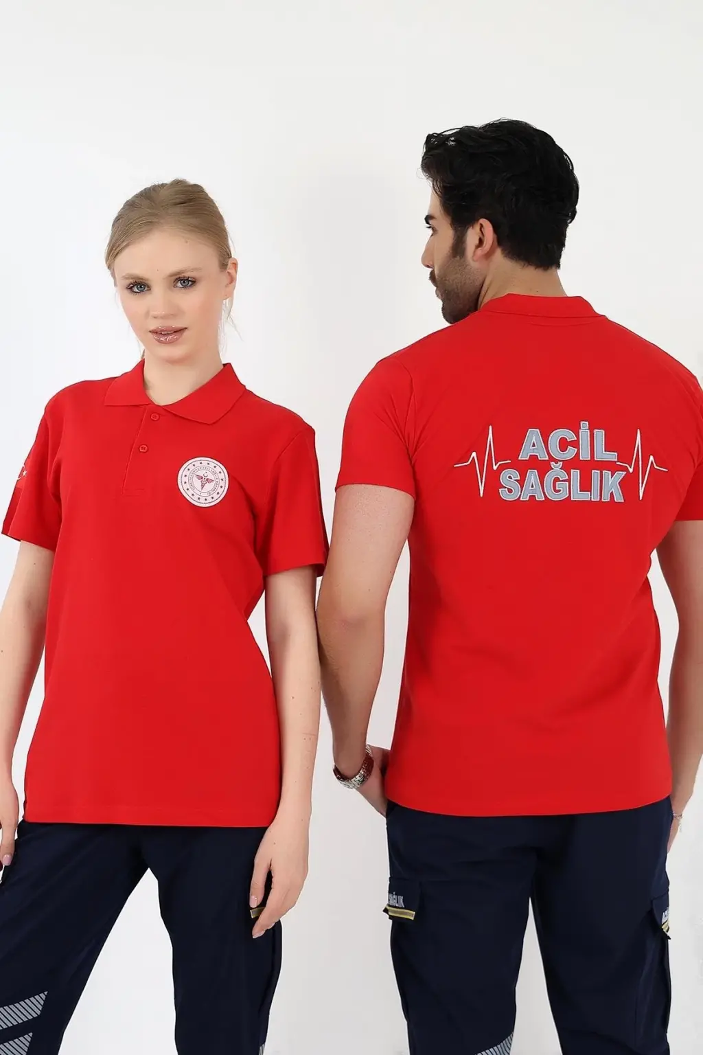 Acil Sağlık Yakalı Tshirt Kısa Kol Nakışlı - Kırmızı