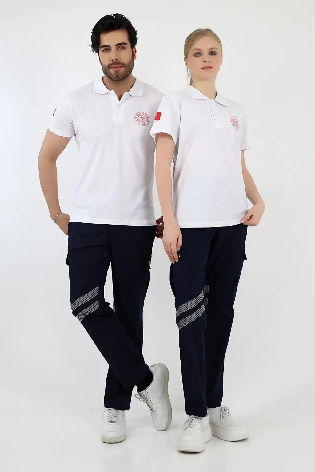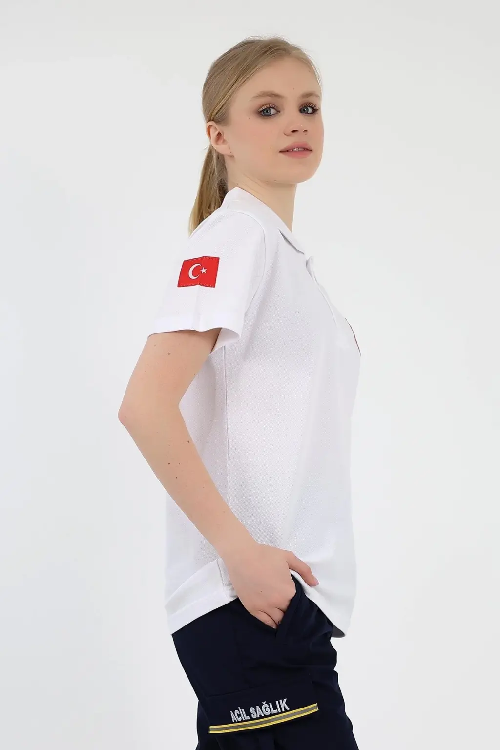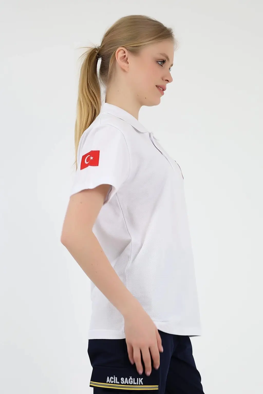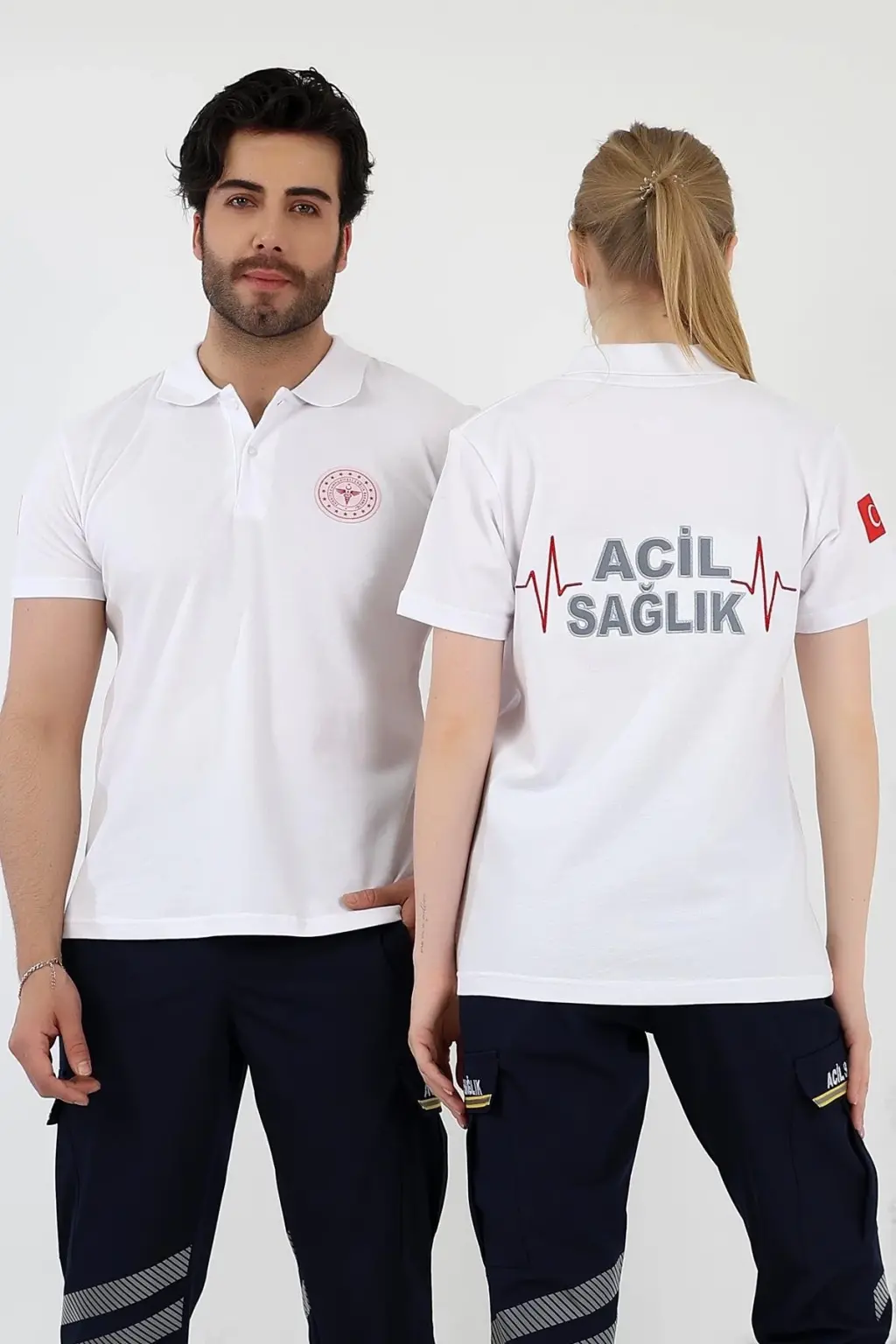 Acil Sağlık Yakalı Unisex Tshirt Kısa Kol Nakışlı - Beyaz
