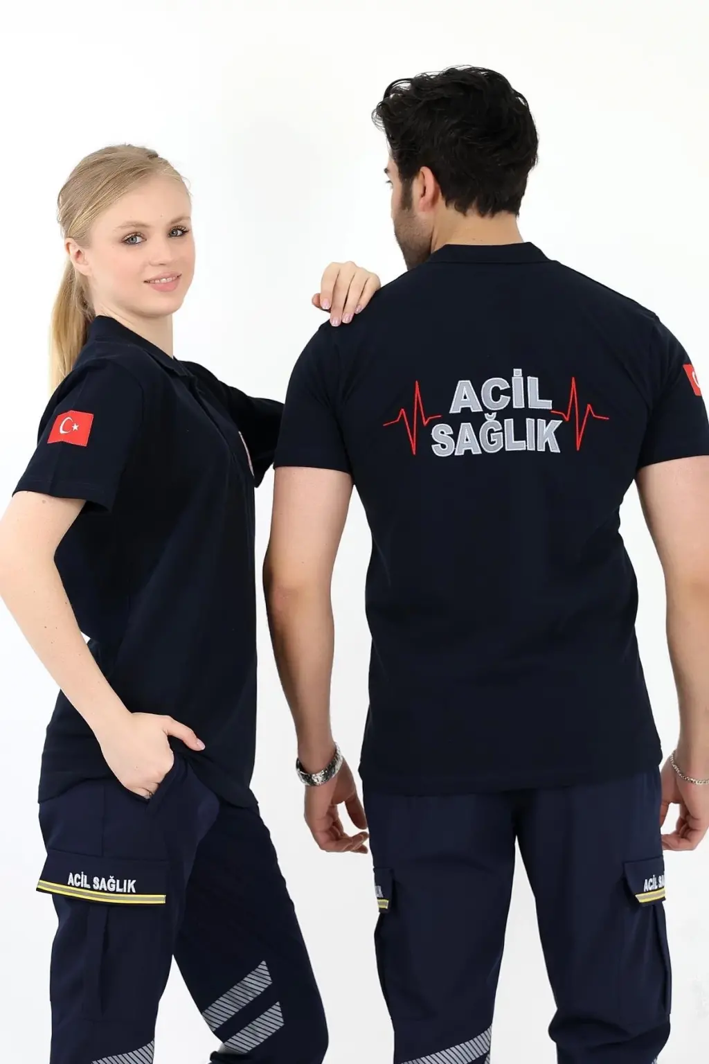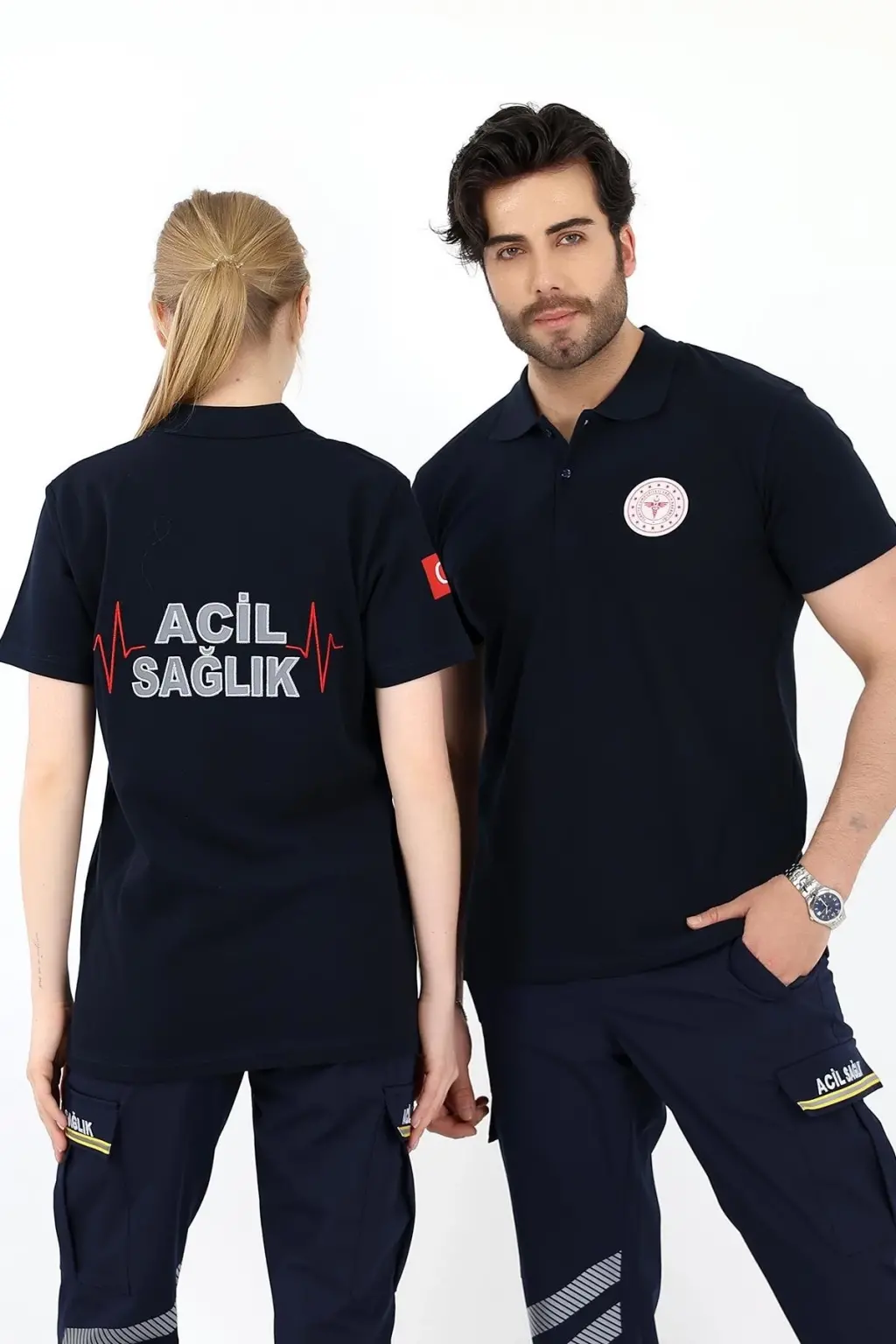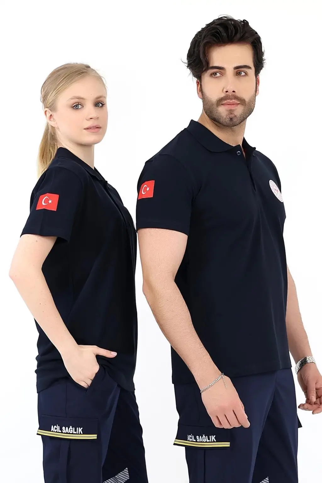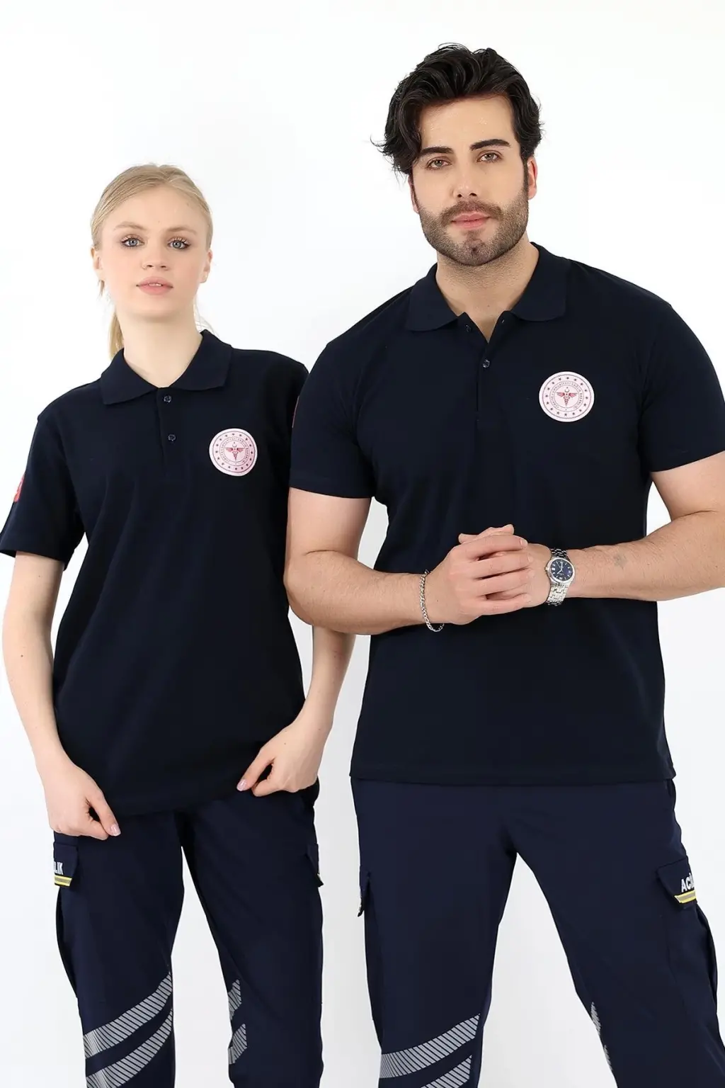 Acil Sağlık Yakalı Unisex Tshirt Kısa Kol Nakışlı - Lacivert