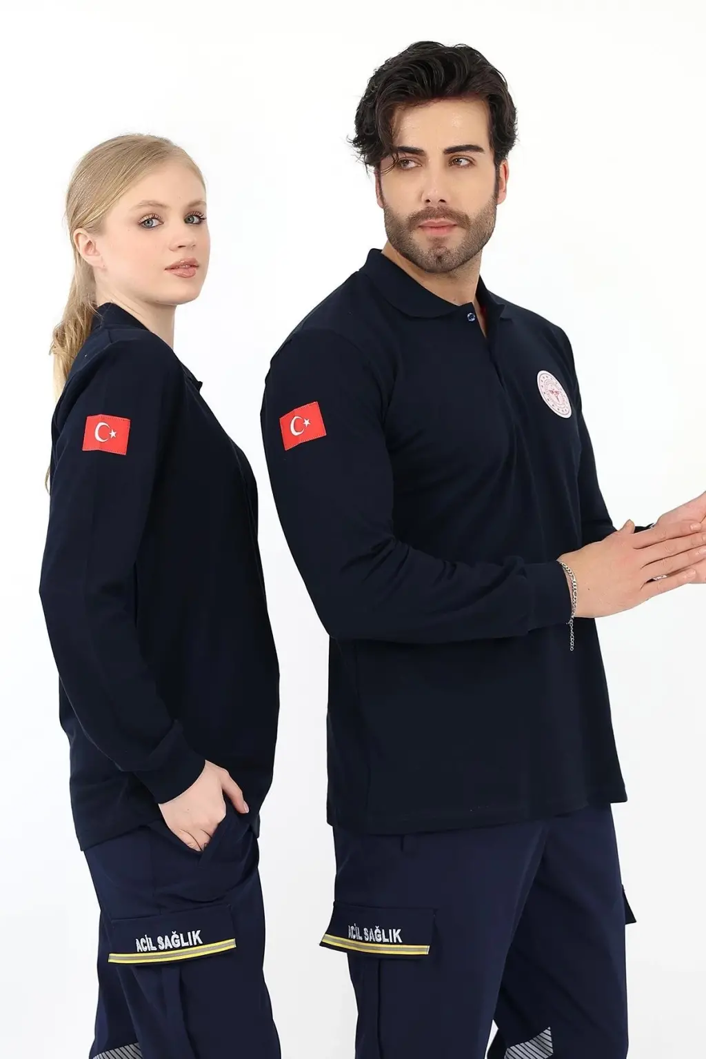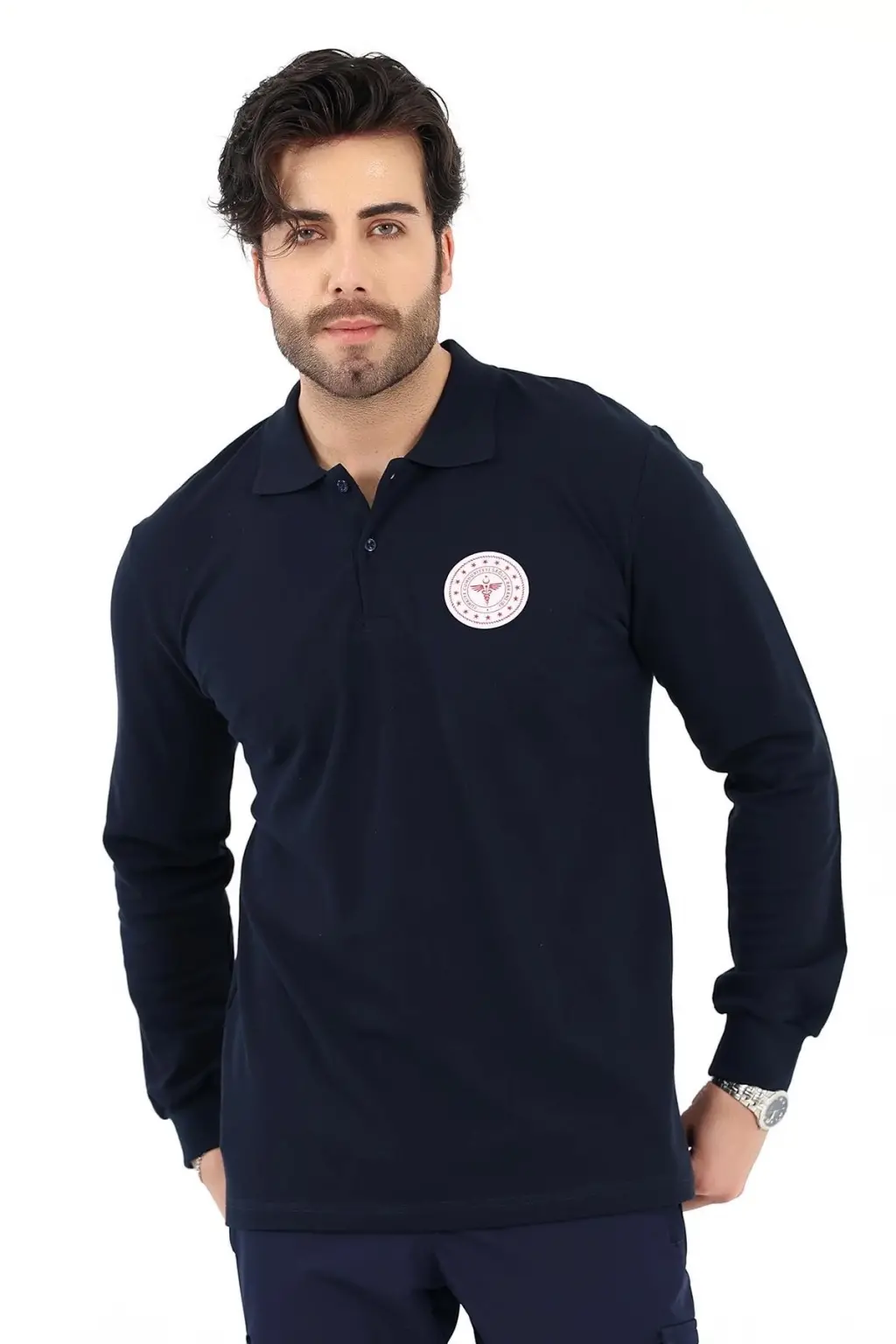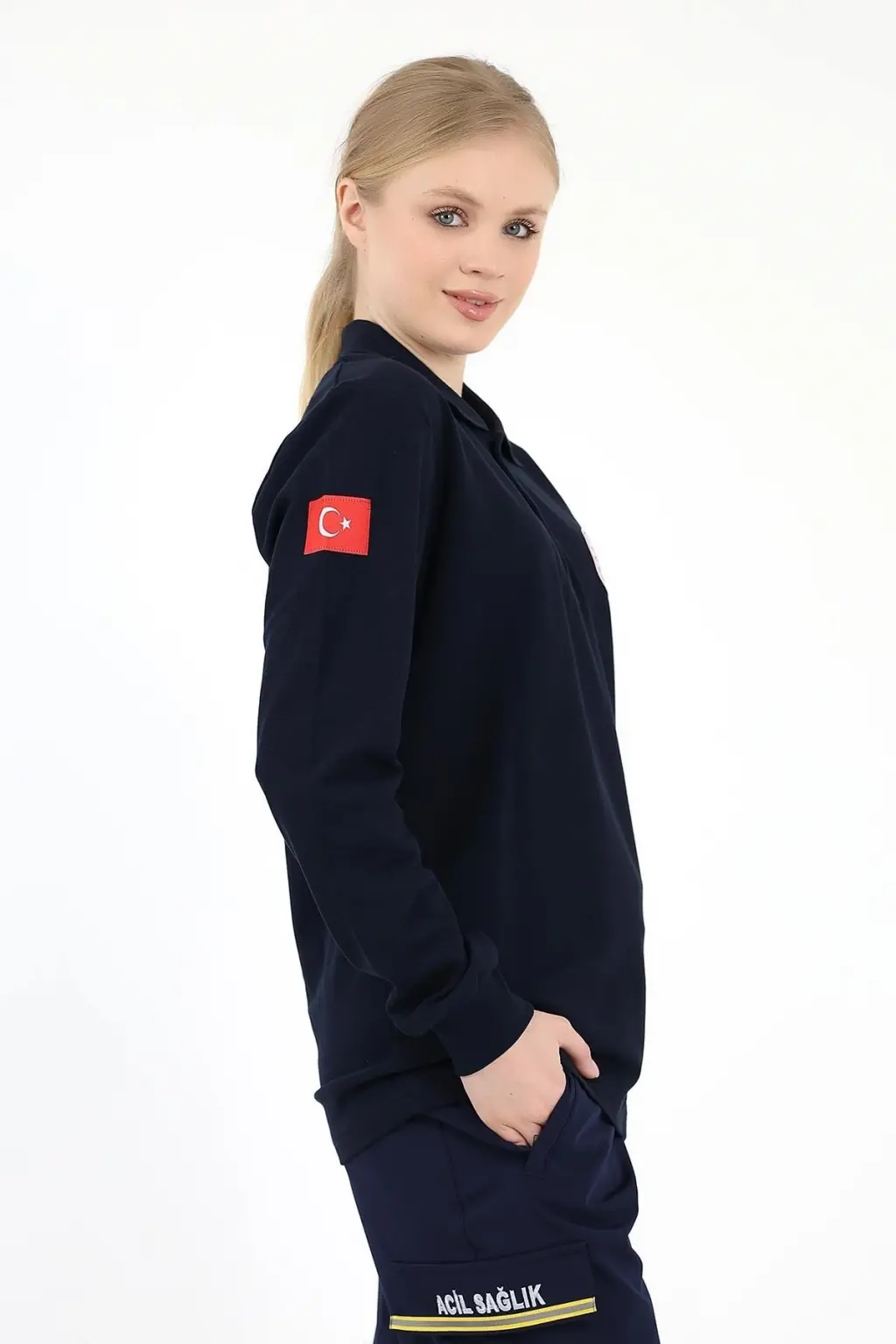 Acil Sağlık Yakalı Unisex Tshirt Uzun Kol Nakışlı - Lacivert