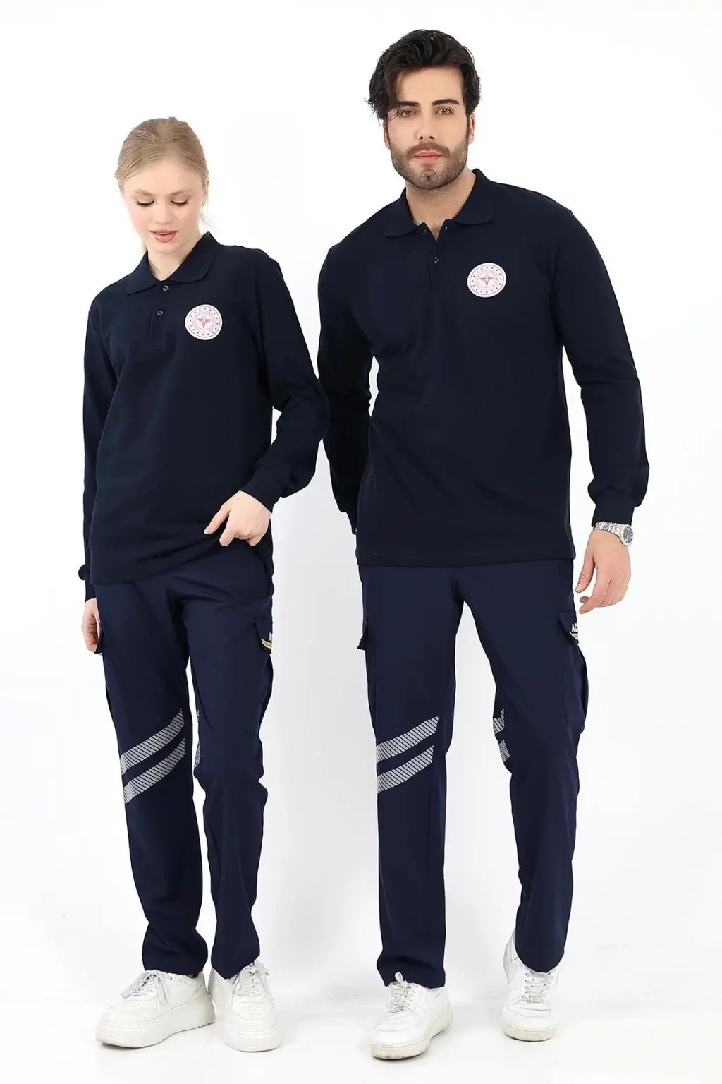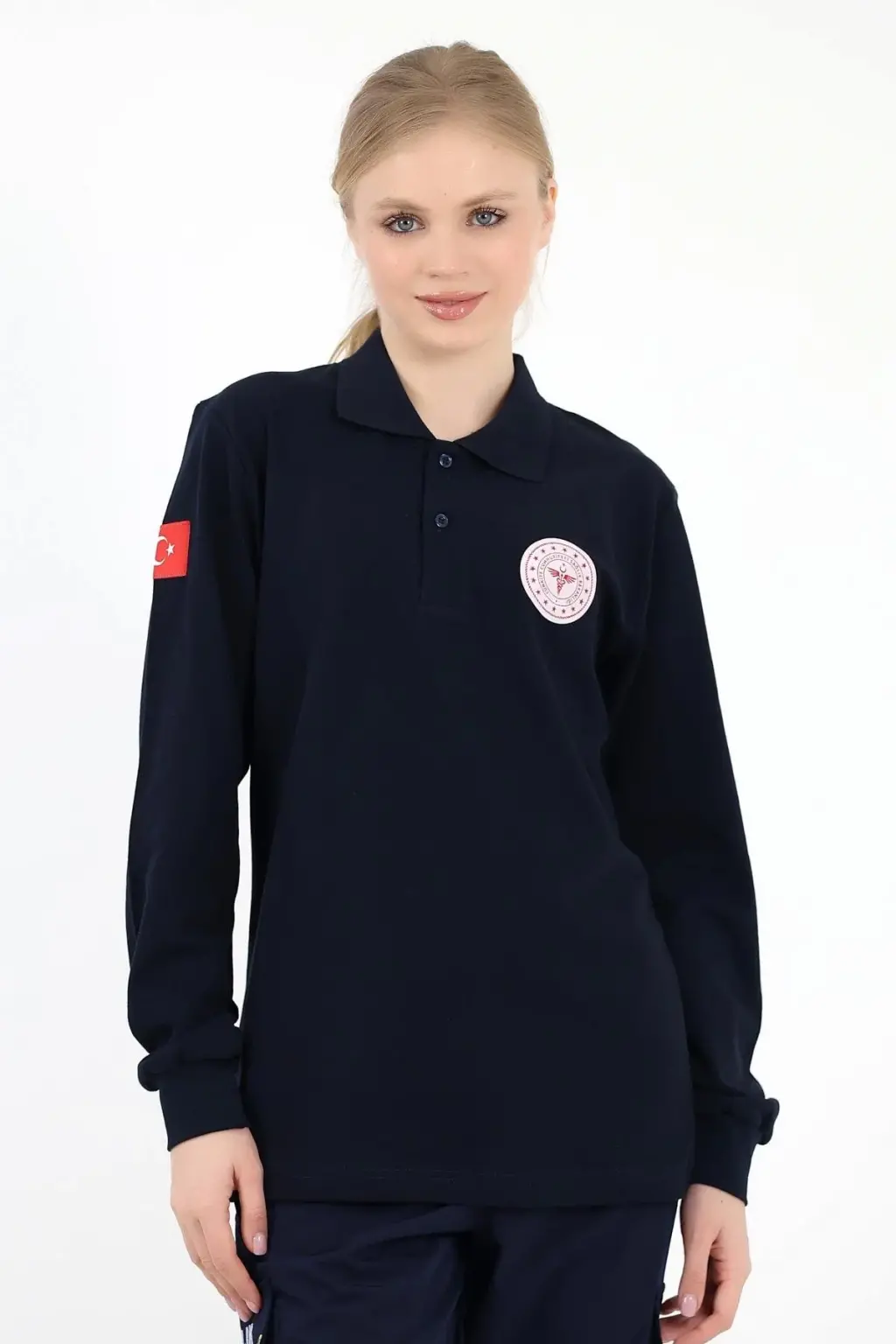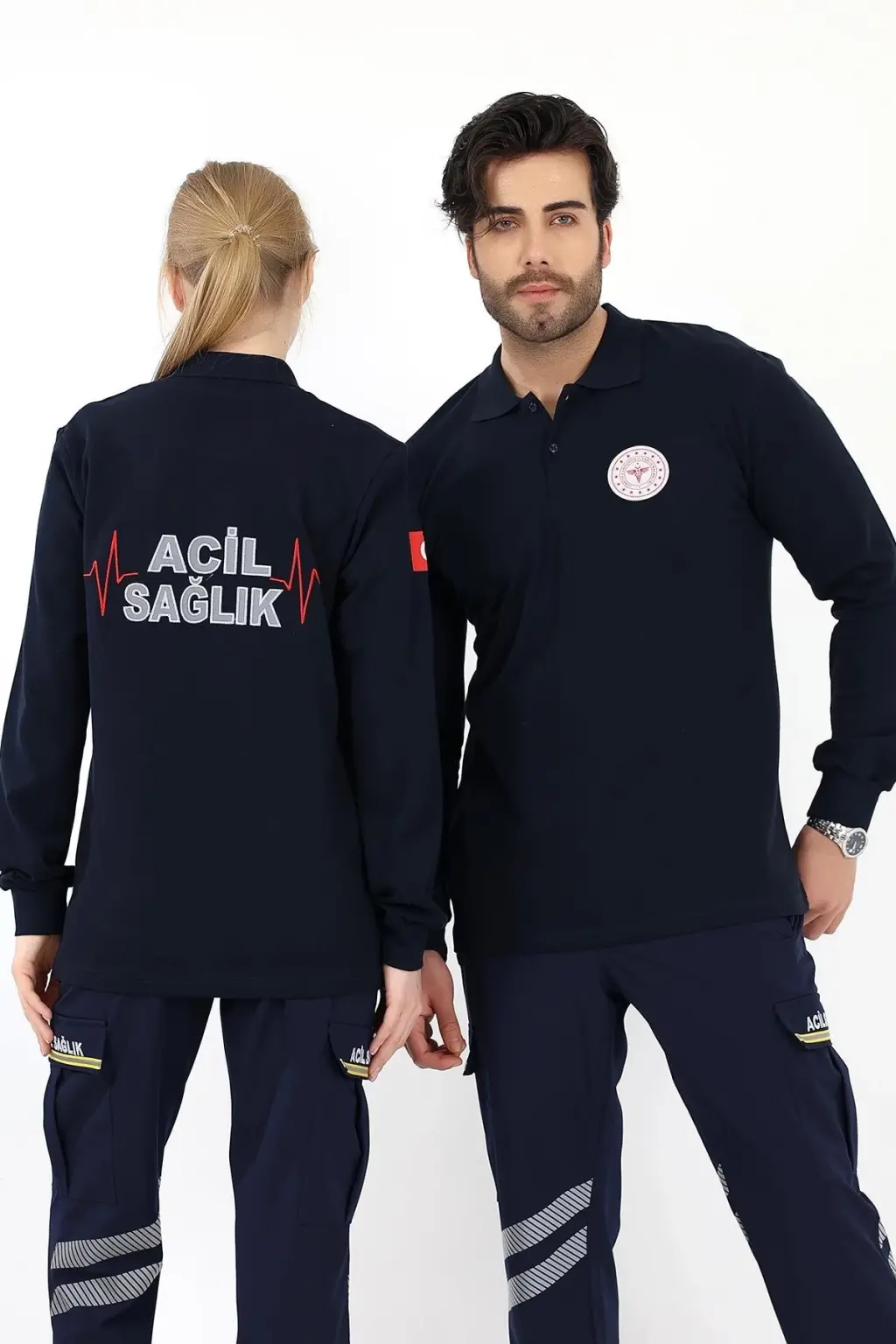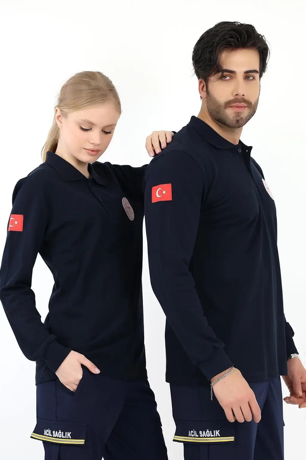 Acil Sağlık Yakalı Unisex Tshirt Uzun Kol Nakışlı - Lacivert