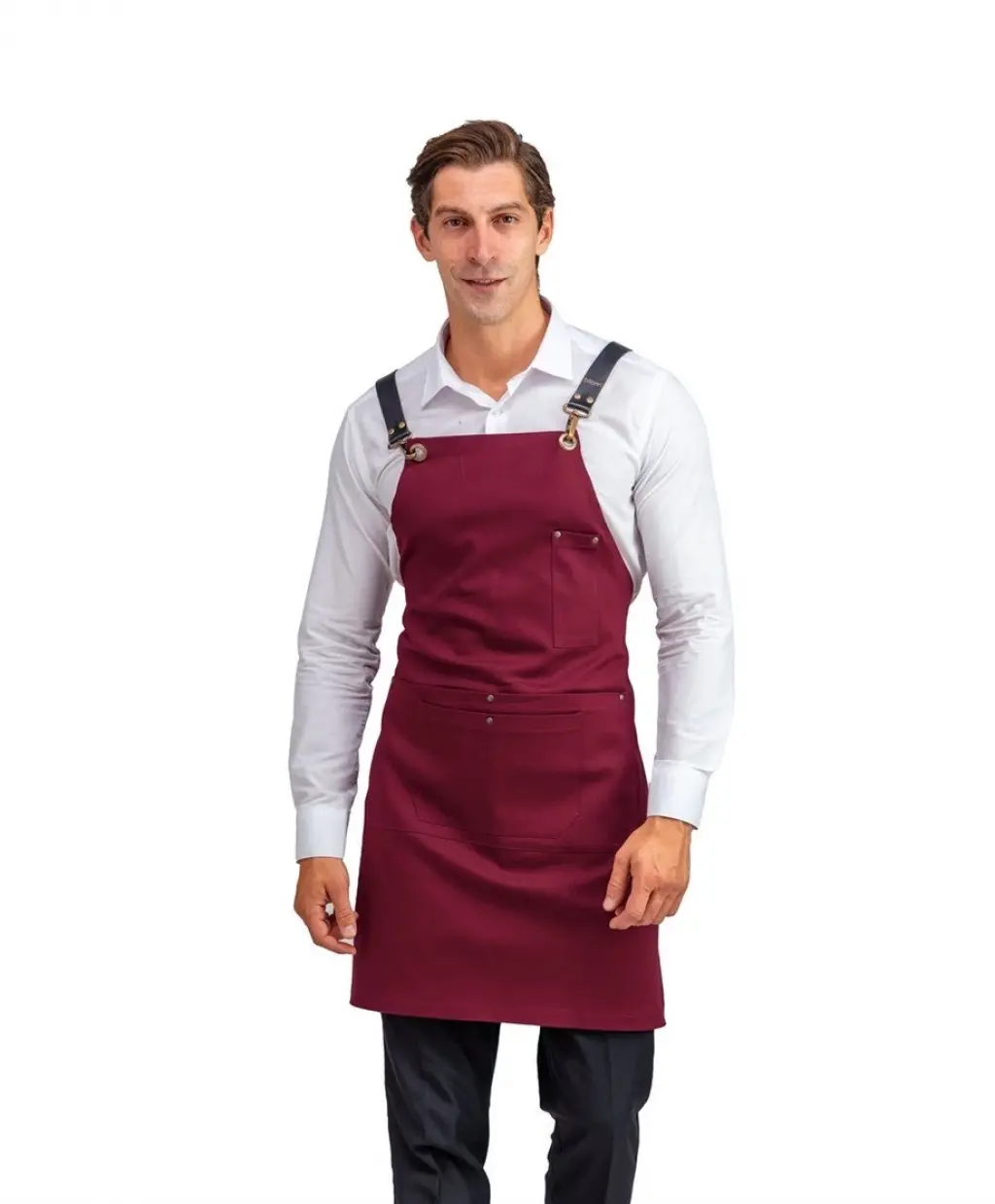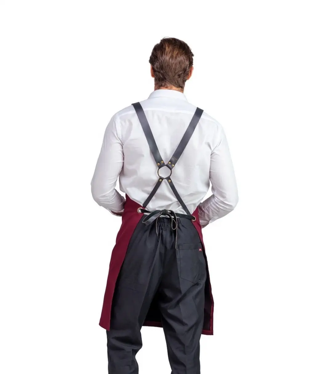 Barista Askılı Önlük Çift Cepli Deri Kemerli Bordo