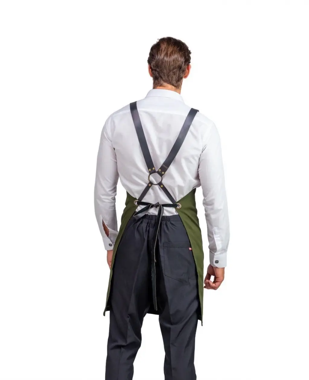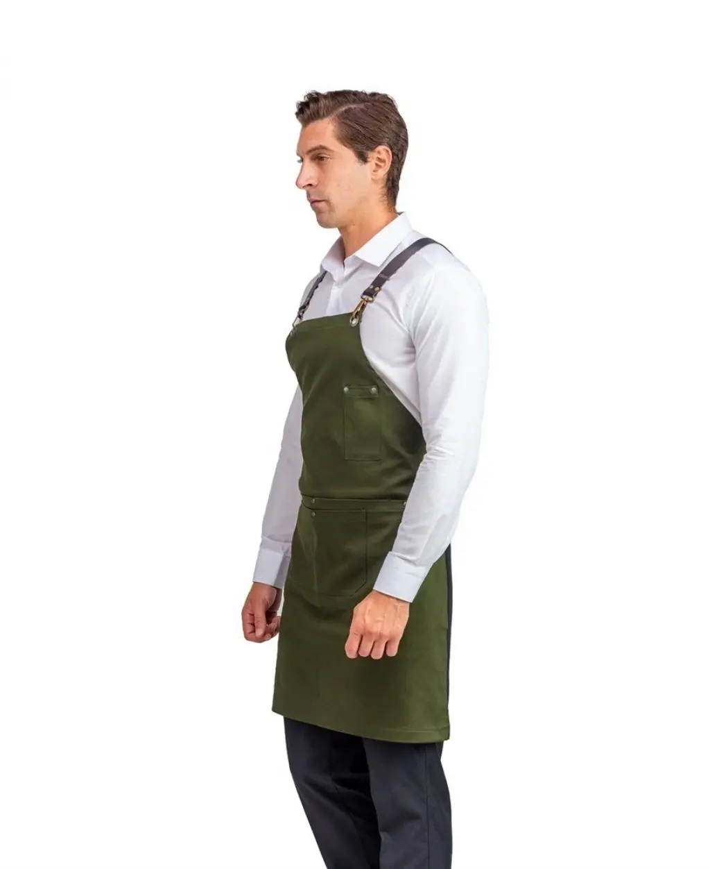 Barista Askılı Önlük Çift Cepli Deri Kemerli Yeşil