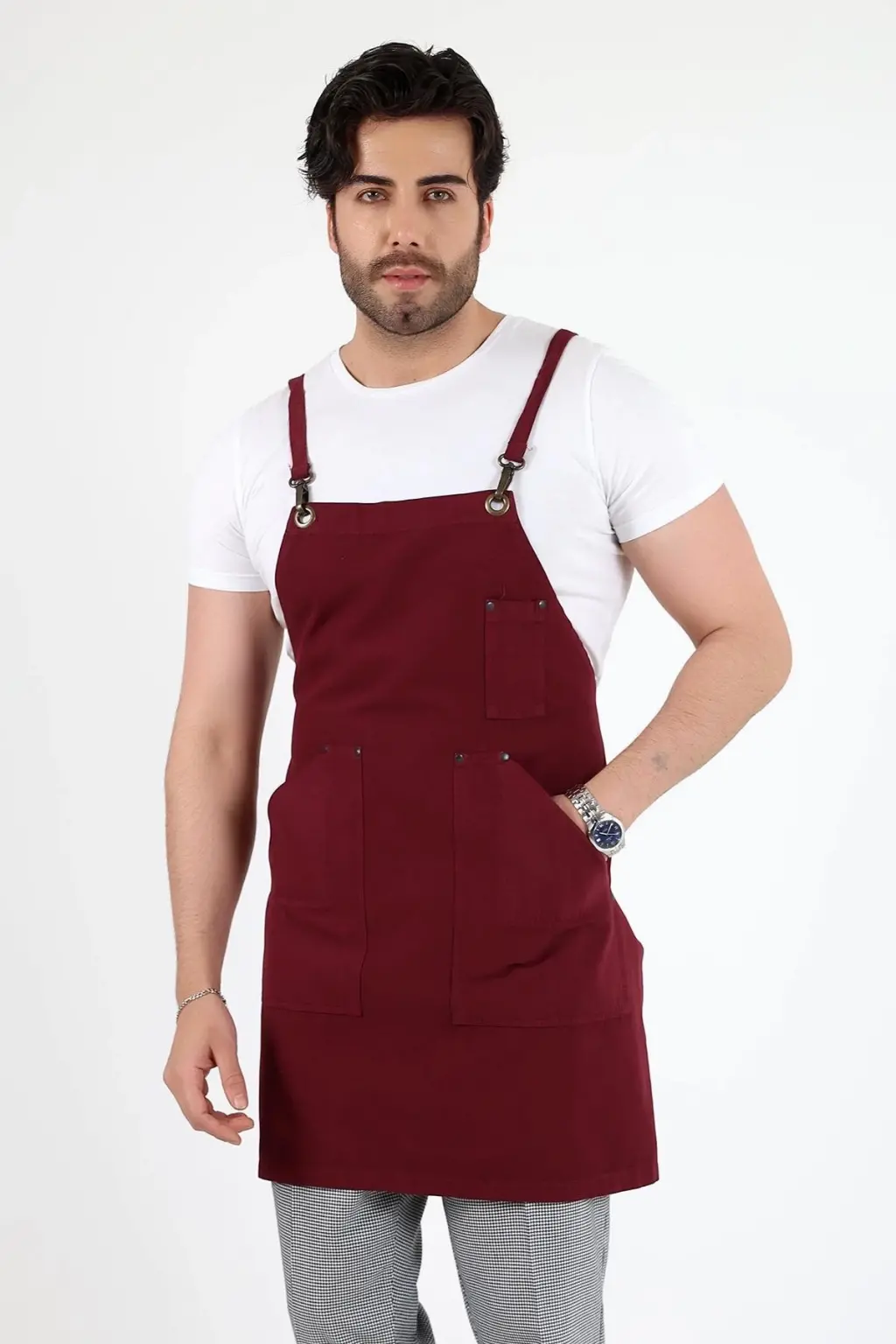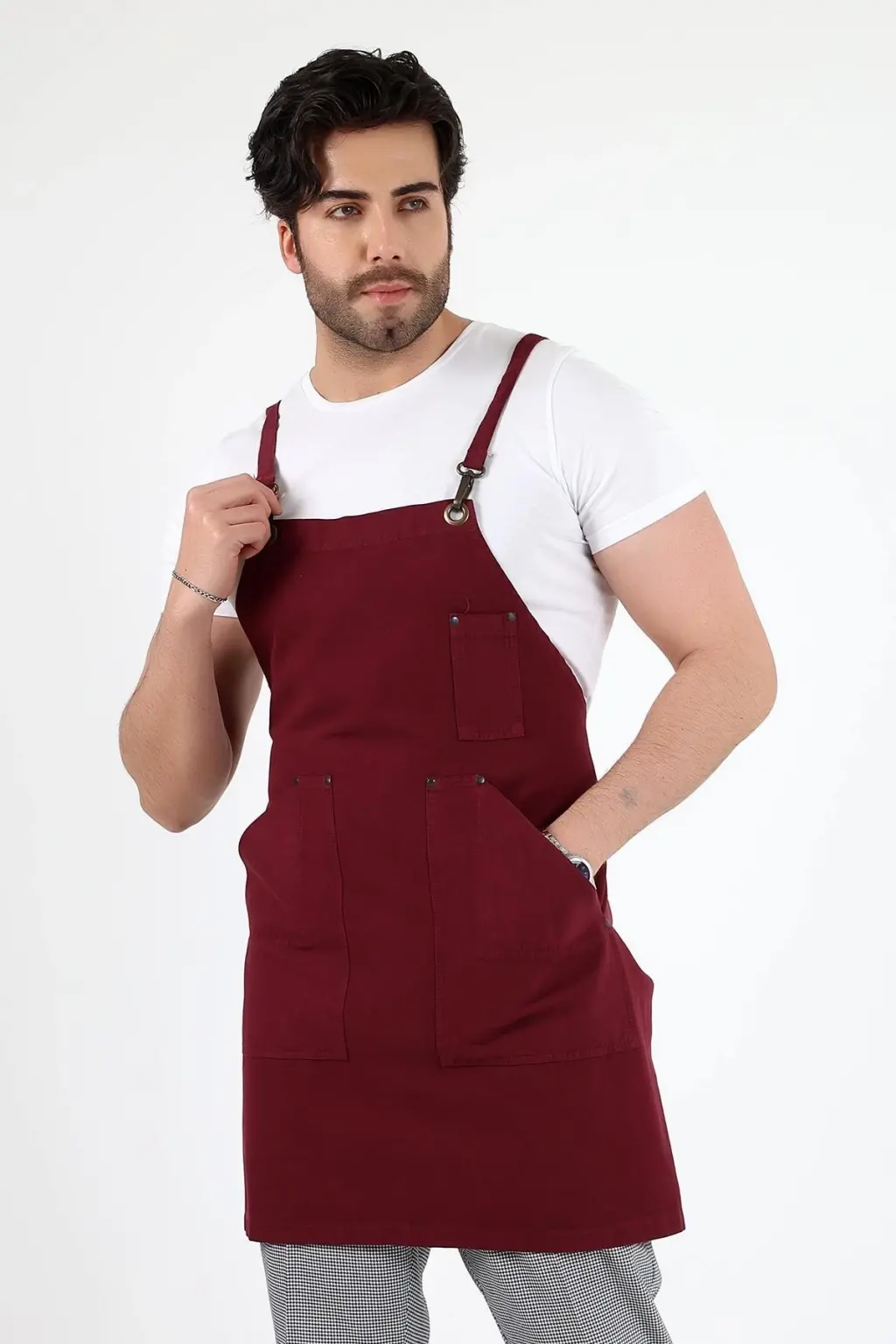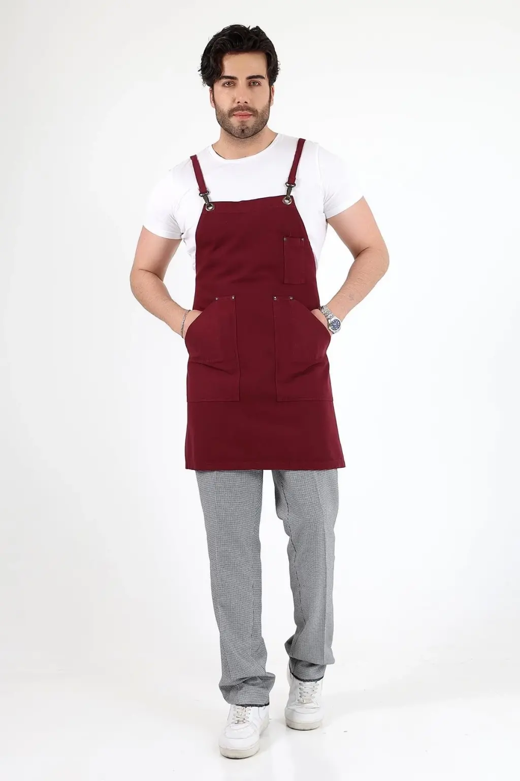 Barista Askılı Önlük Kanguru Cepli - Bordo