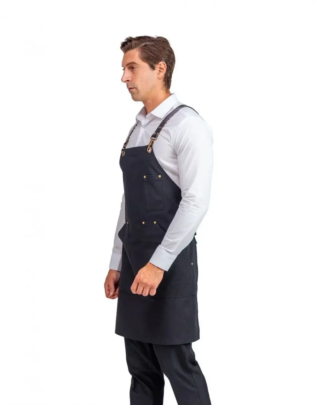 Barista Askılı Önlük Kanguru Cepli Deri Kemerli - Siyah