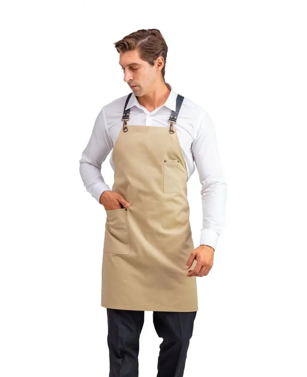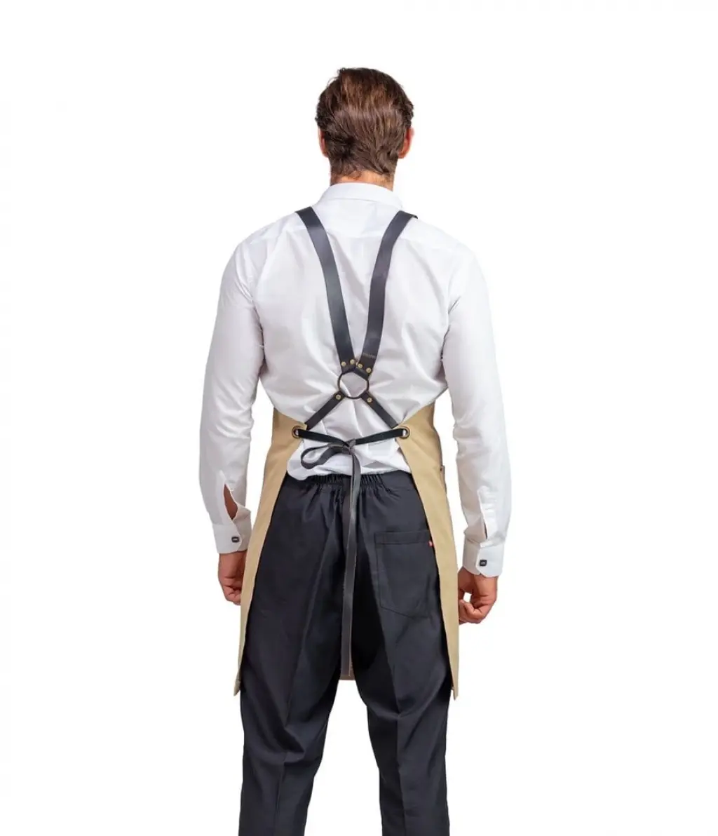 Barista Askılı Önlük Tek Cepli Deri Kemerli - Bej
