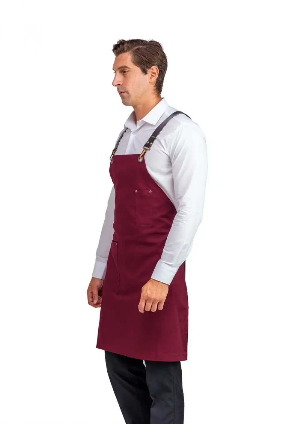 Barista Askılı Önlük Tek Cepli Deri Kemerli - Bordo