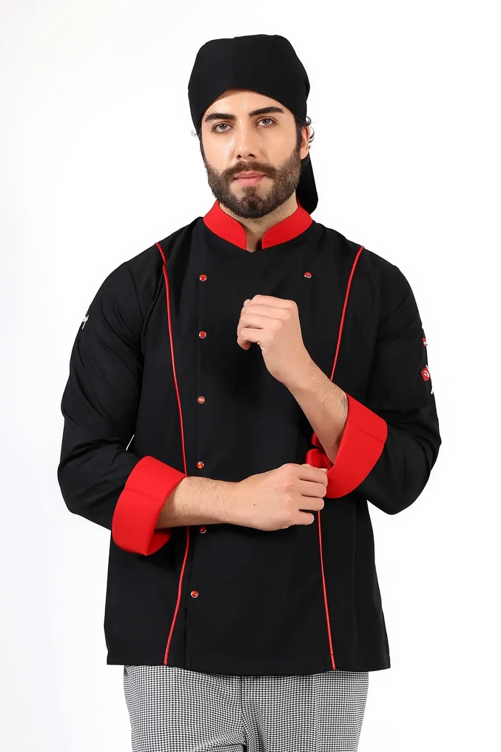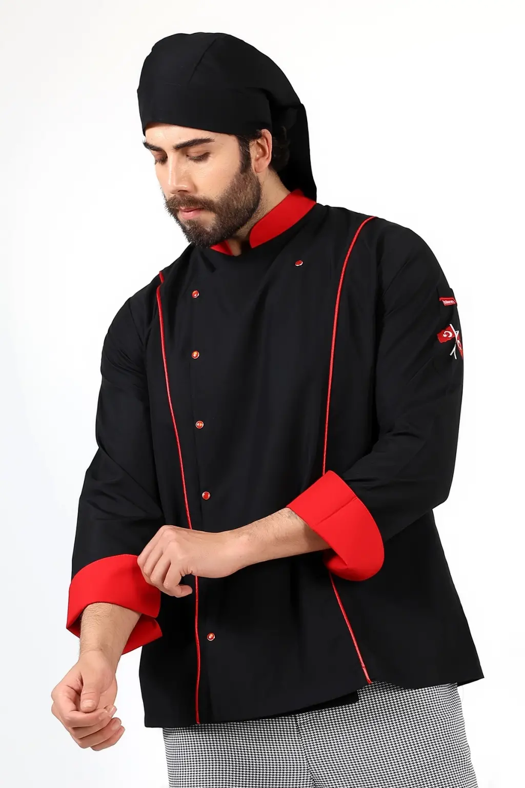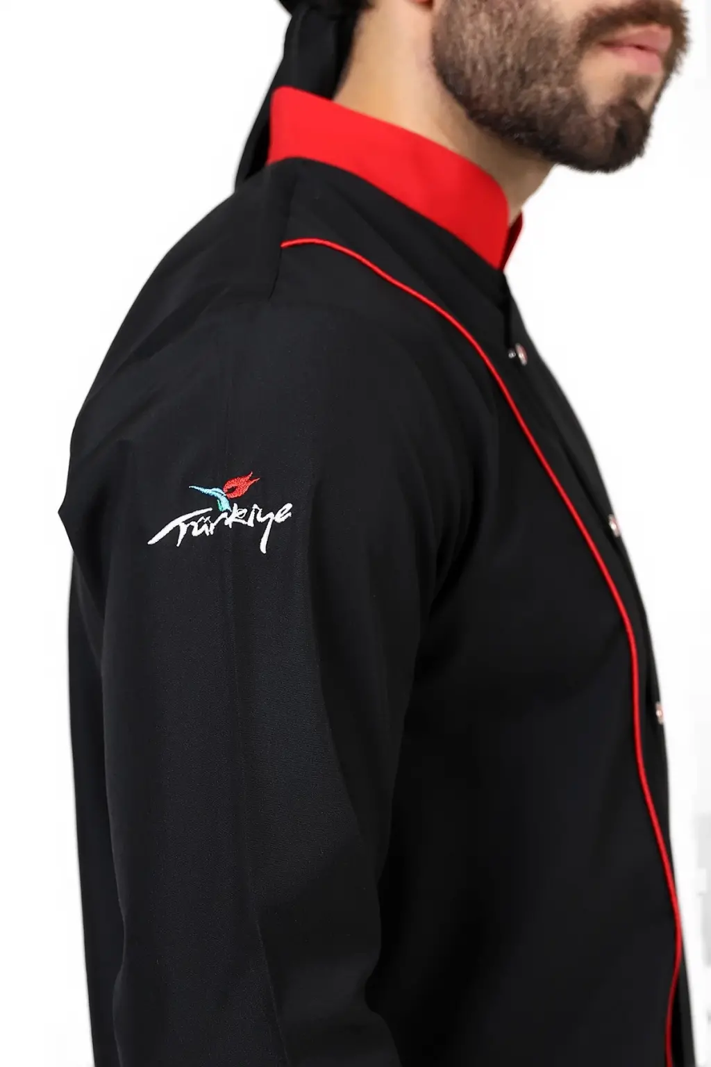 Erkek Aşçı Ceket 01 - Siyah Kırmızı Biye