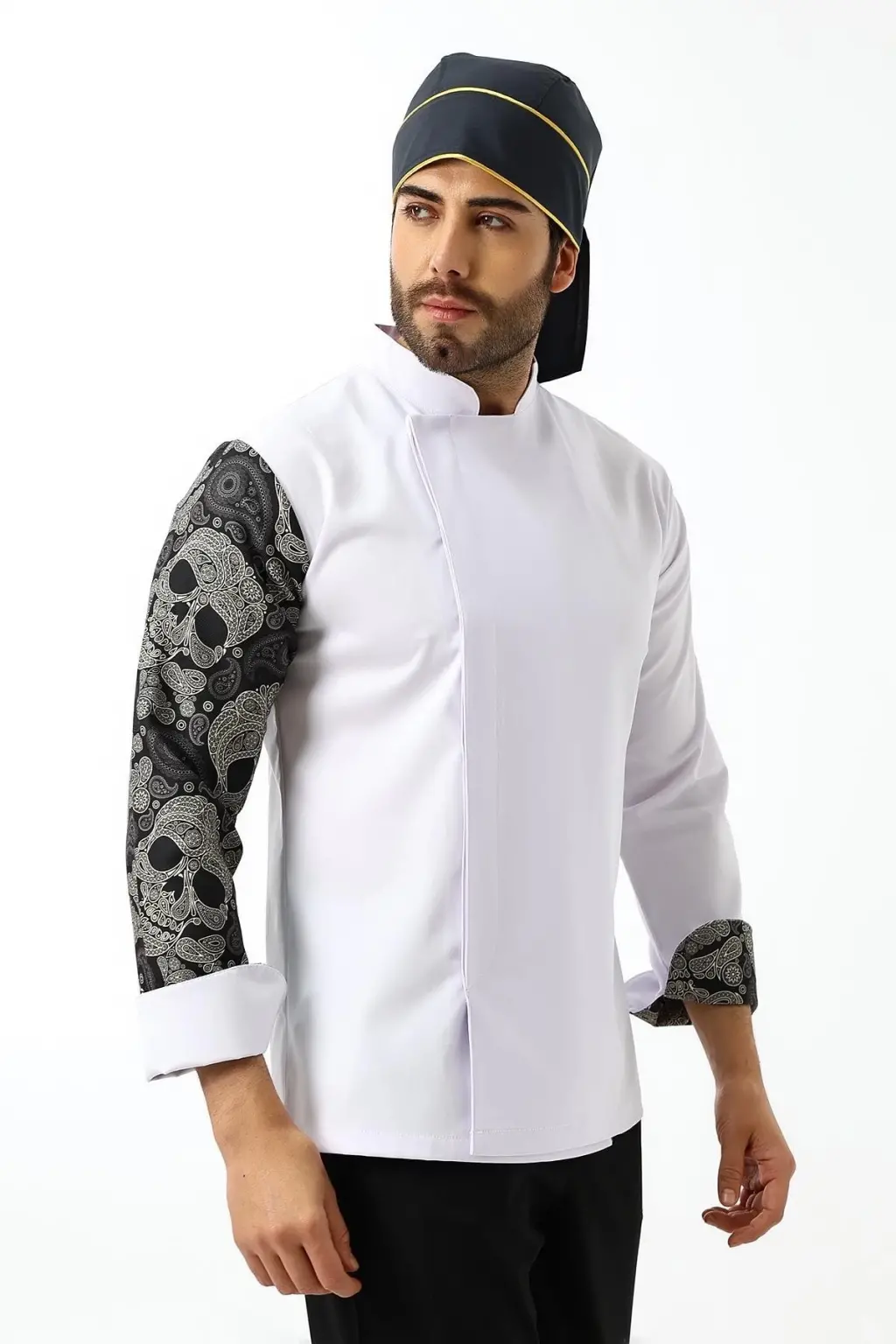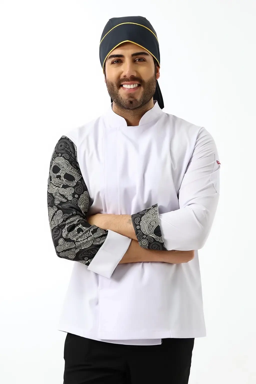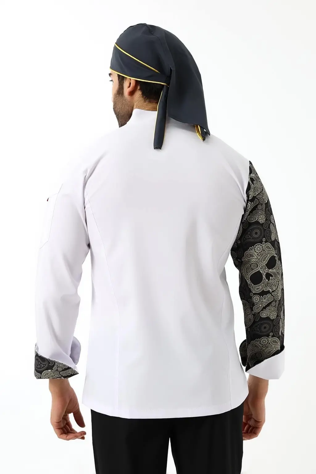 Erkek Likralı Kol Desenli Aşçı Ceket - 6401 Beyaz Kuru Kafa