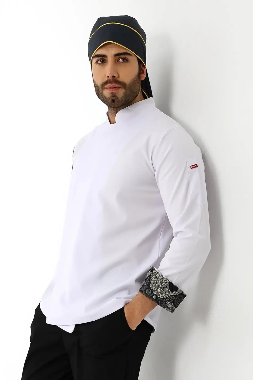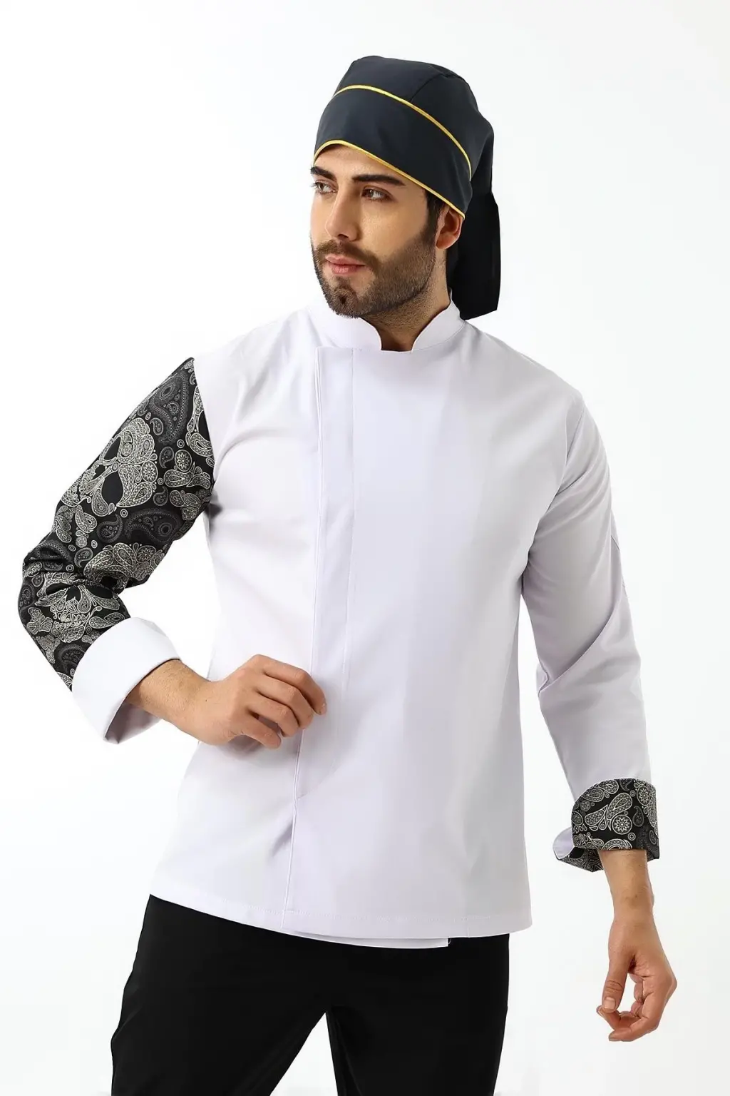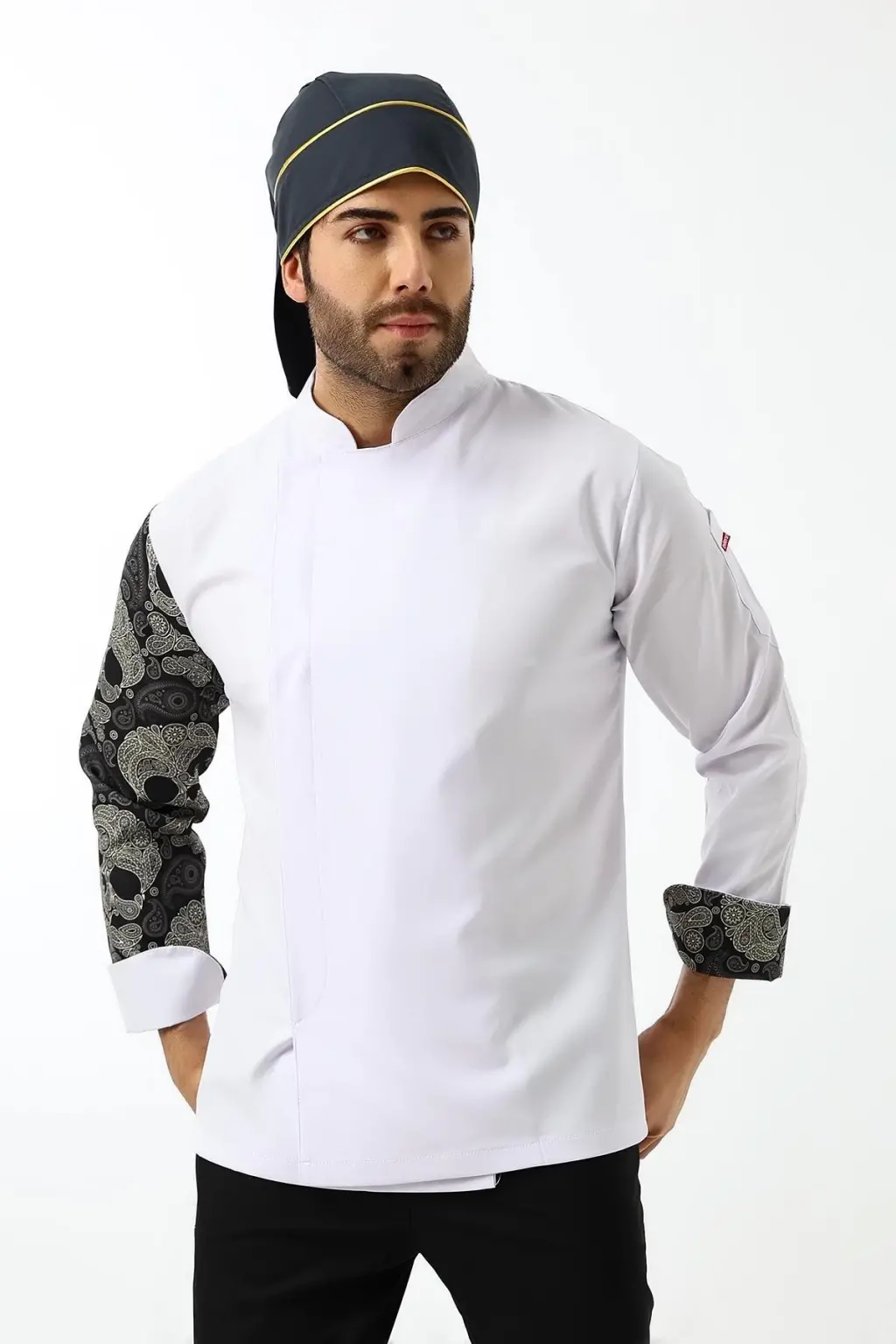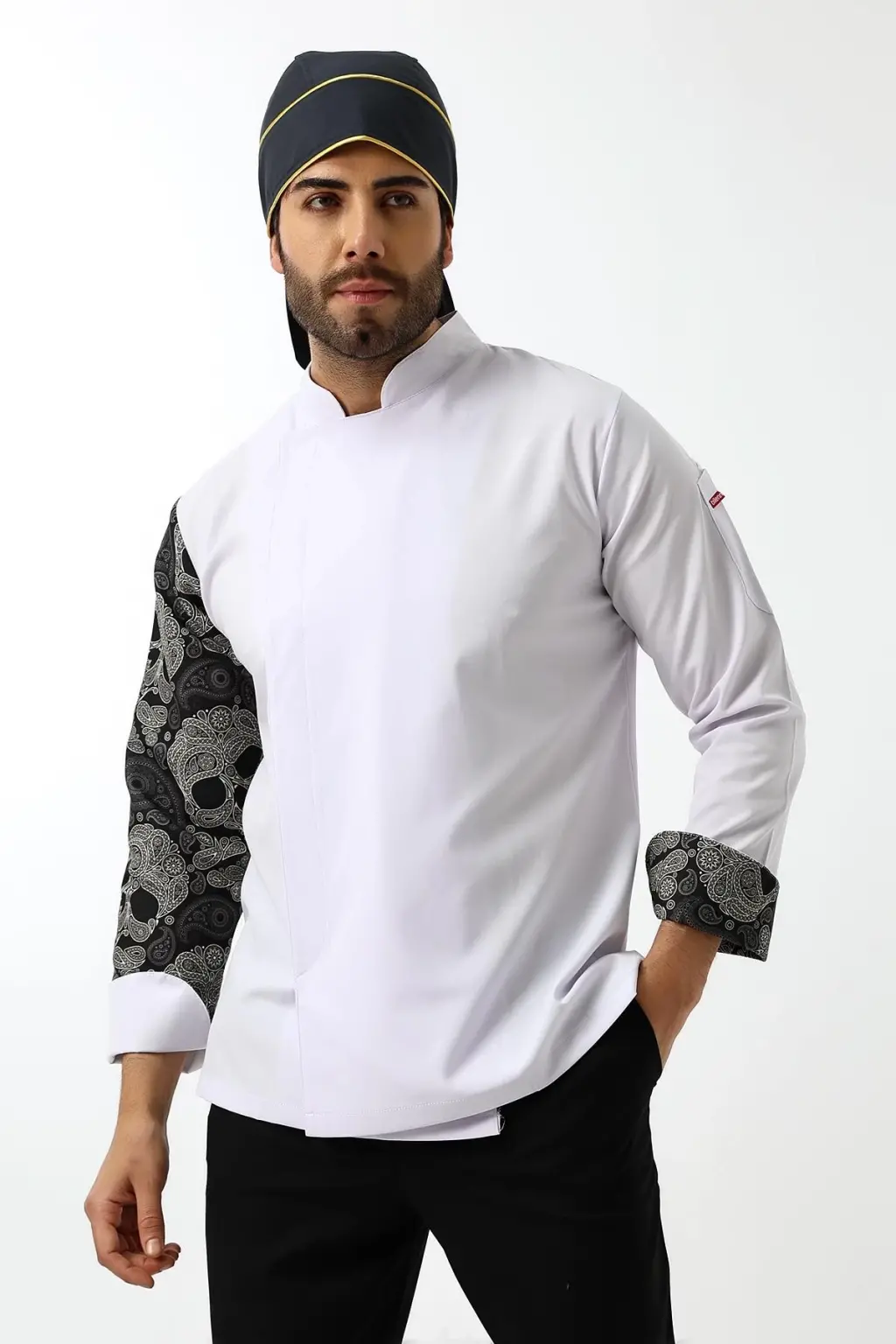 Erkek Likralı Kol Desenli Aşçı Ceket - 6401 Beyaz Kuru Kafa