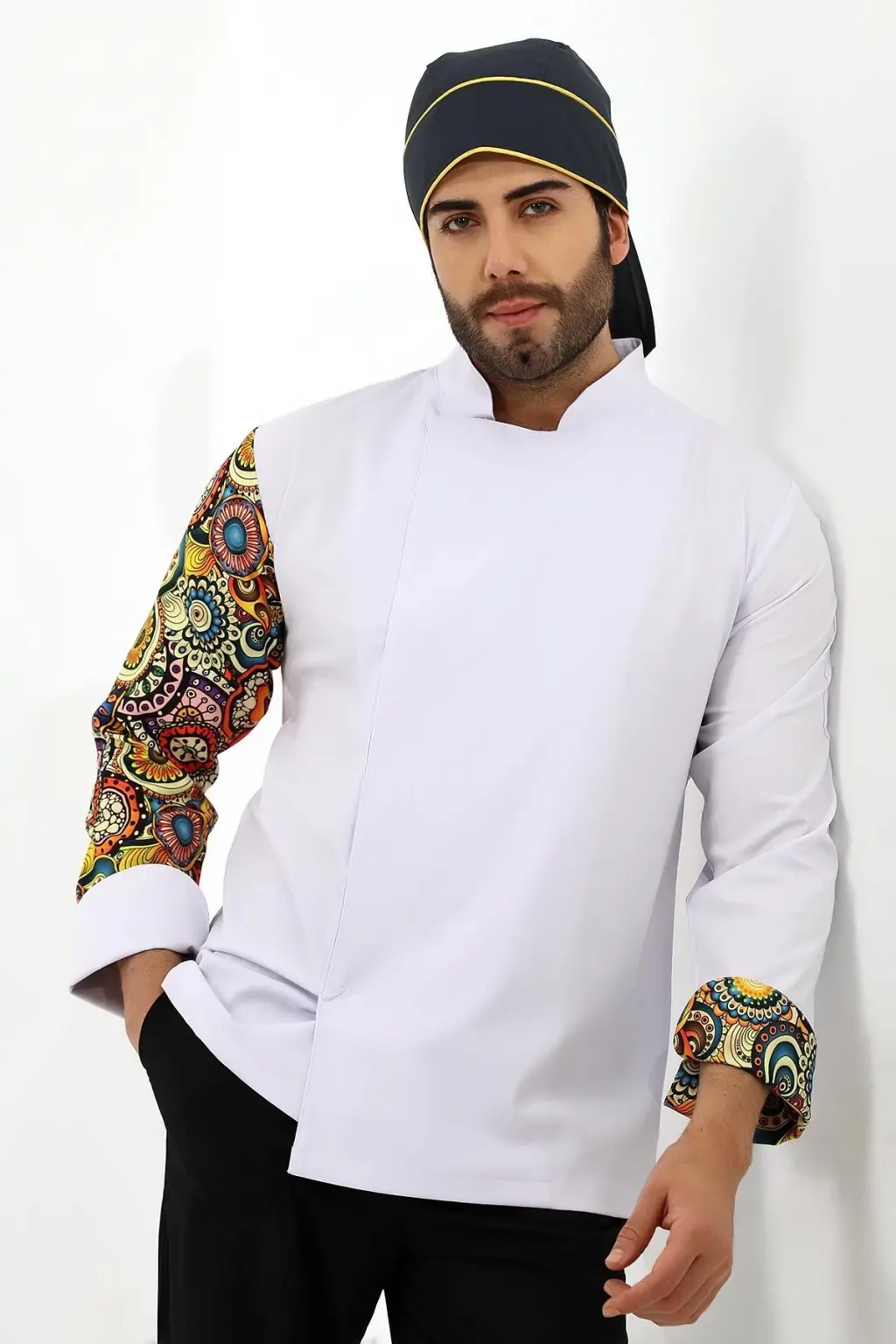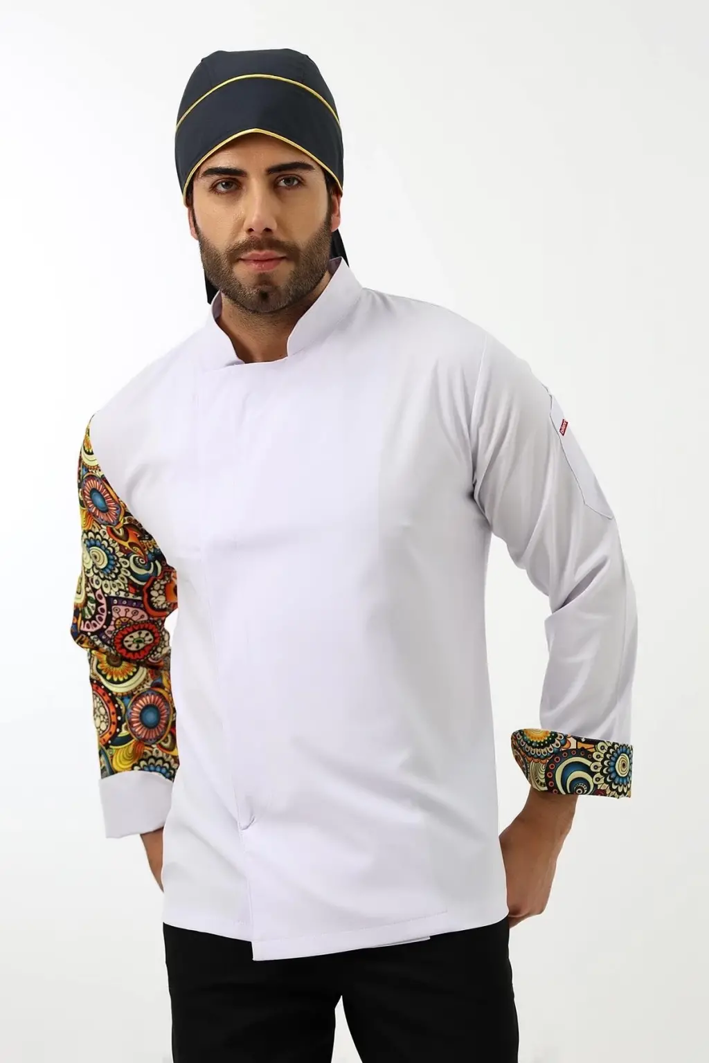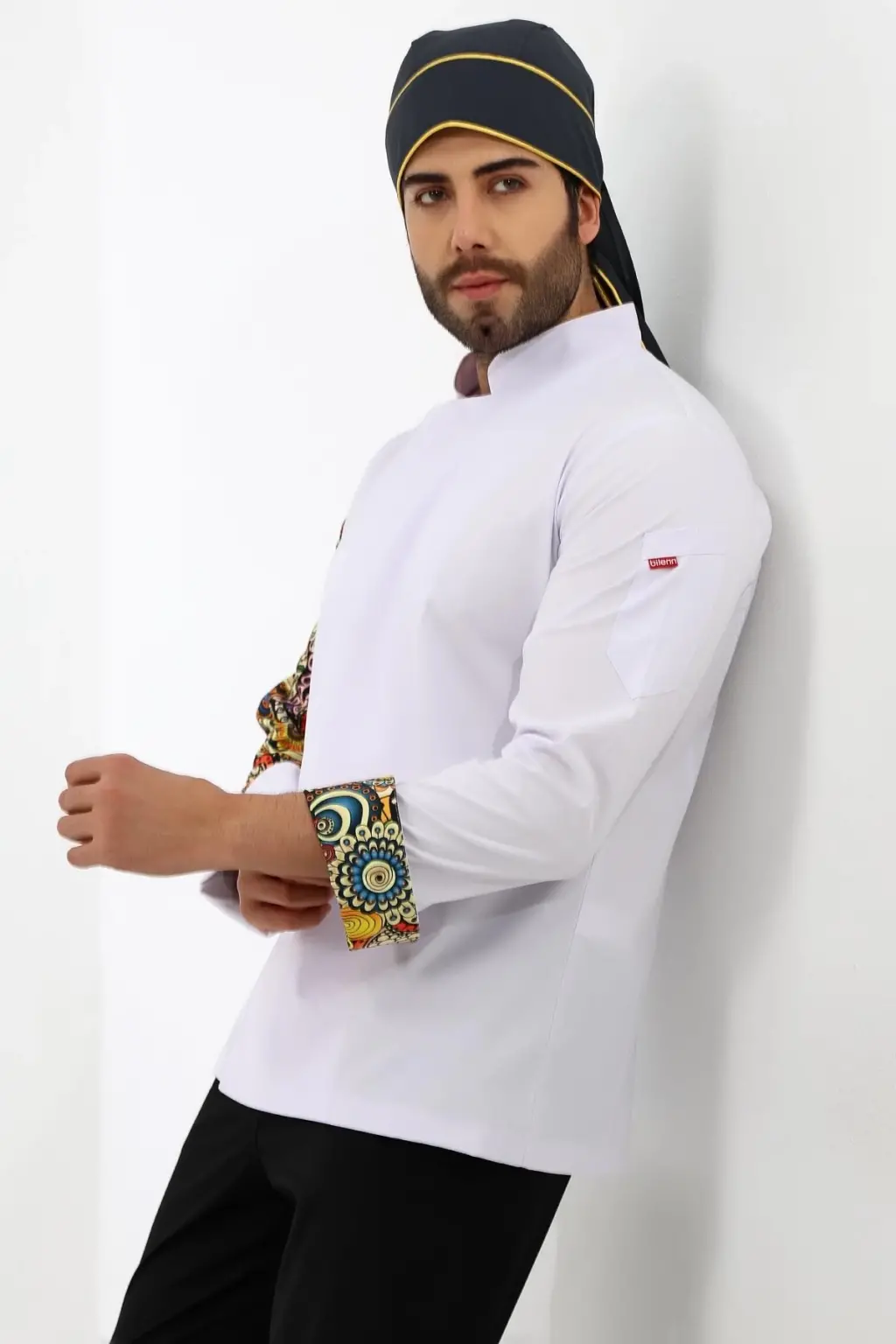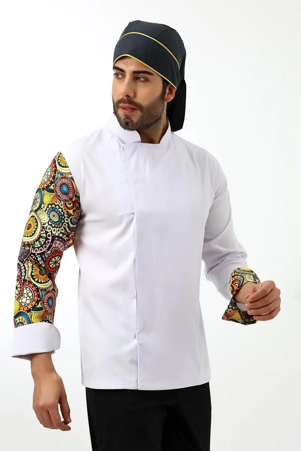 Erkek Likralı Kol Desenli Aşçı Ceket - 6401 Beyaz Renkli Daire