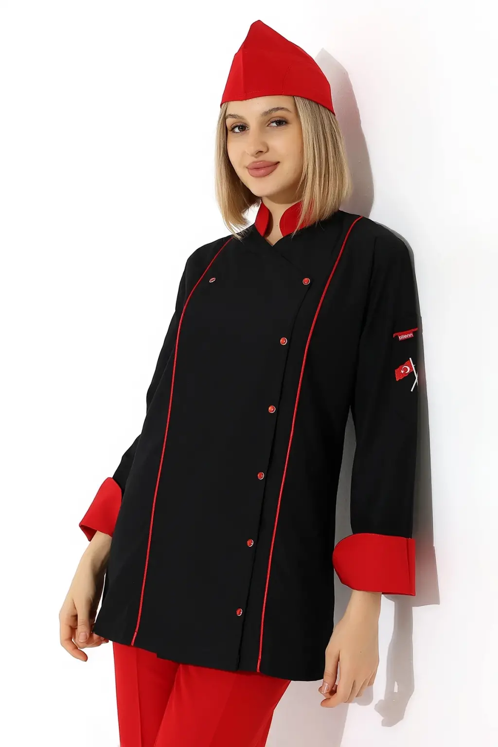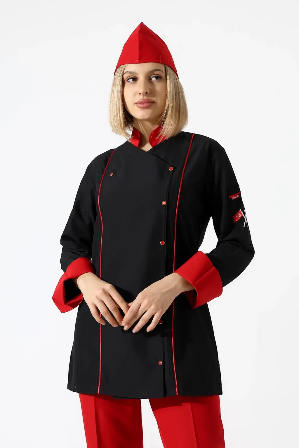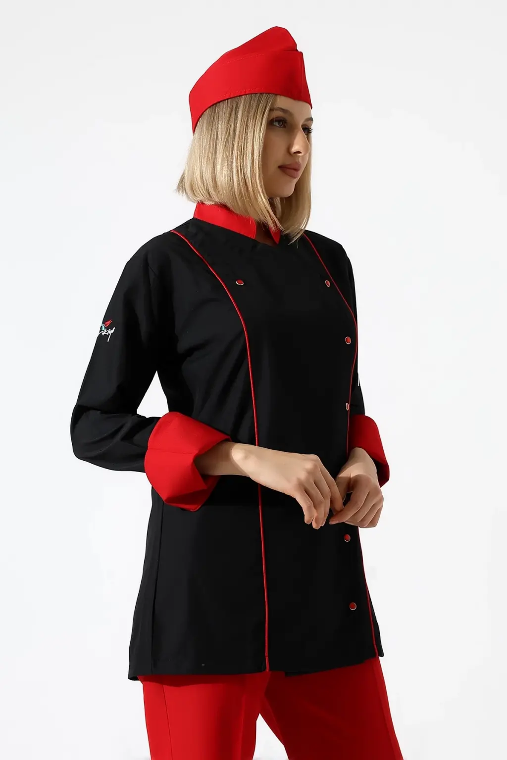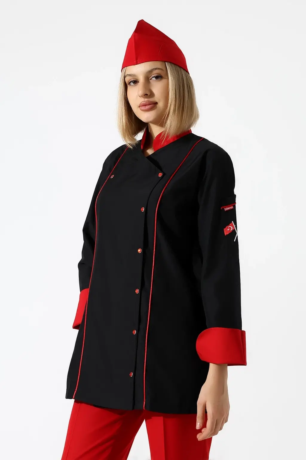 Kadın Aşçı Ceket 01 - Siyah Kırmızı Biye