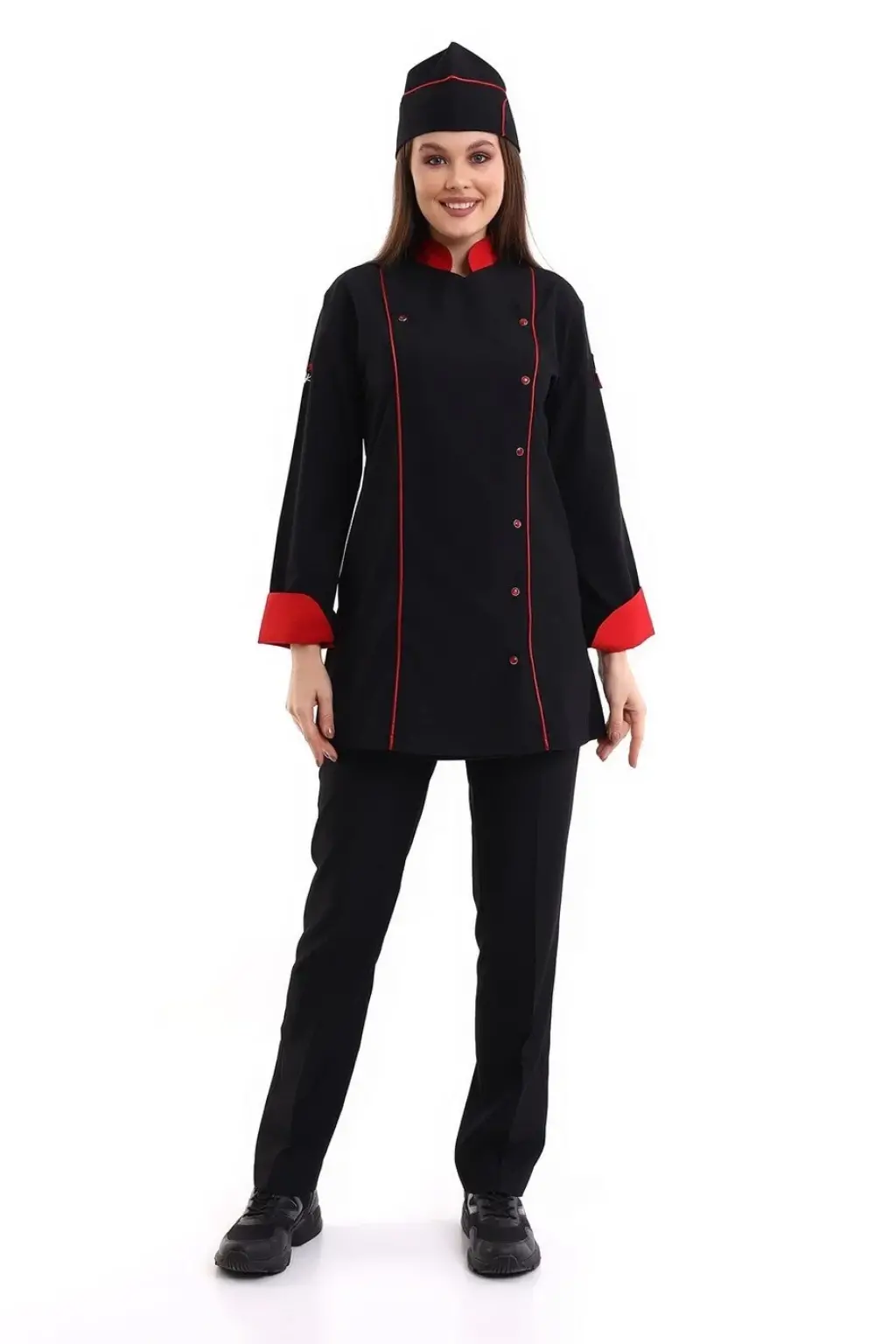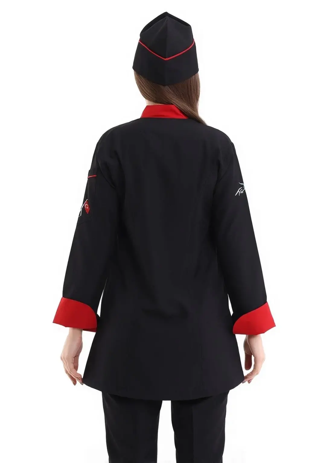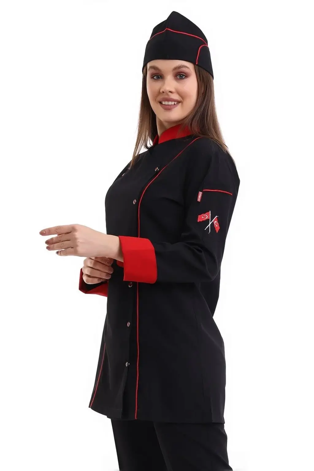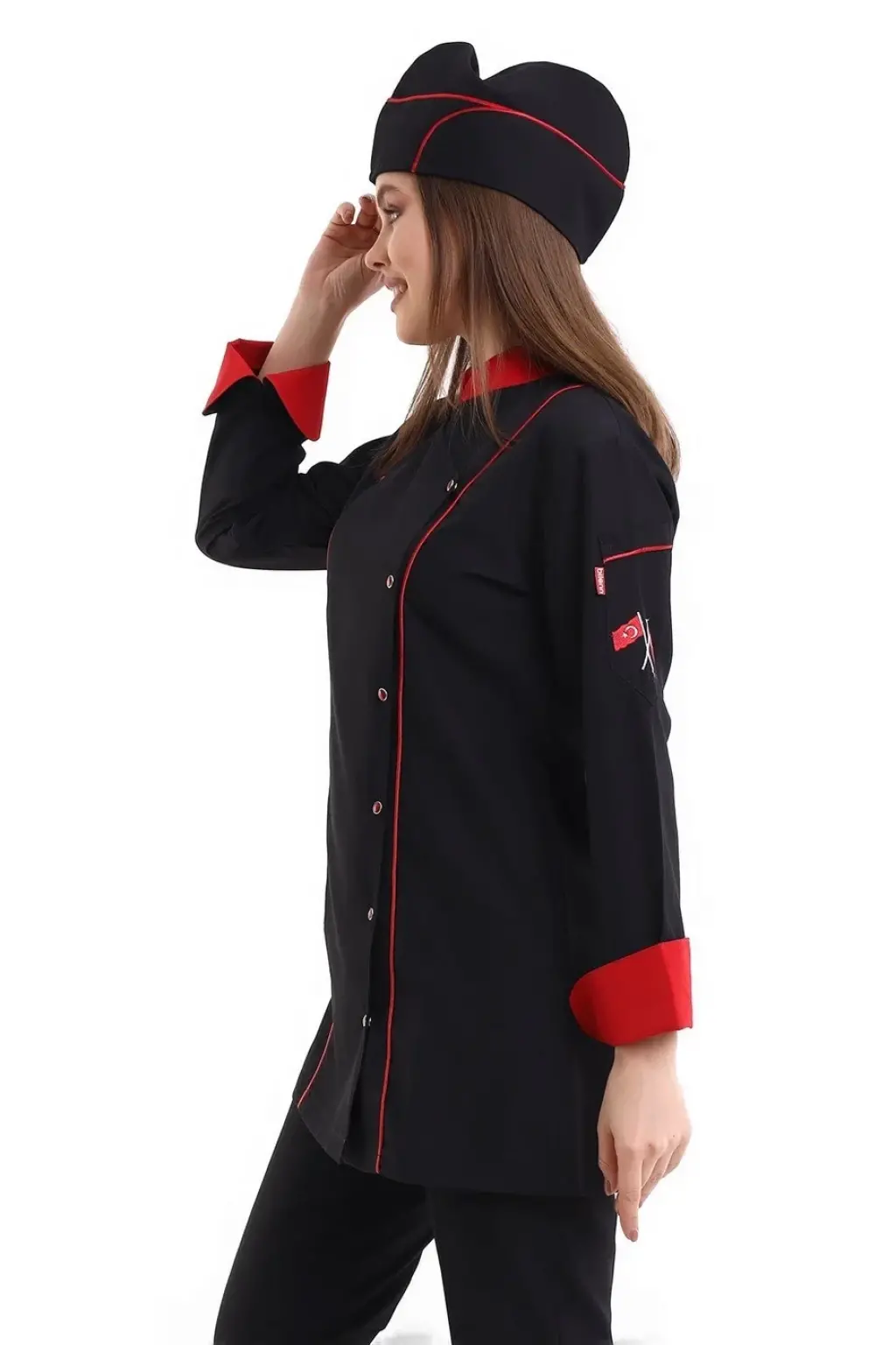 Kadın Aşçı Ceket 01 - Siyah Kırmızı Biye