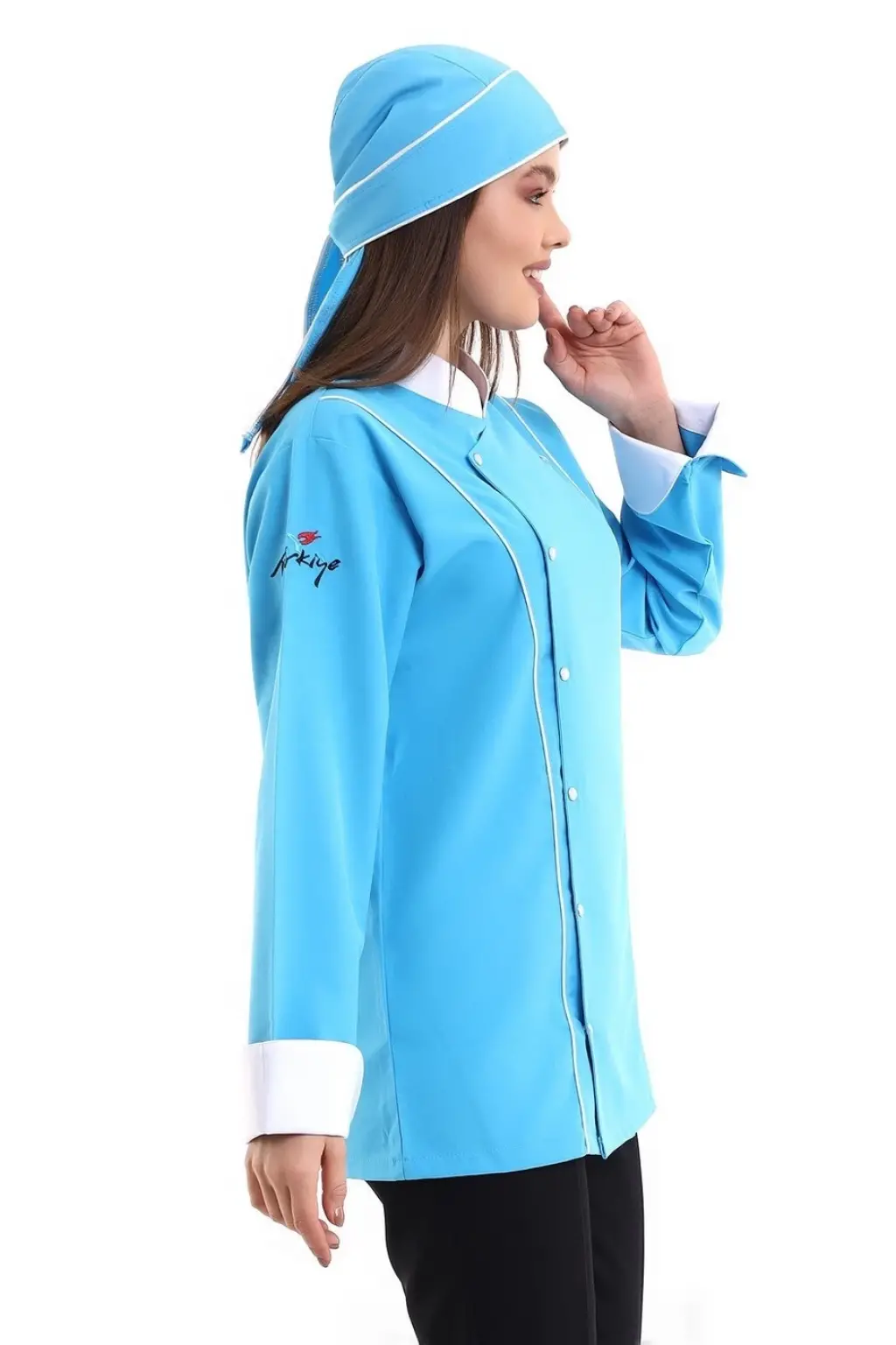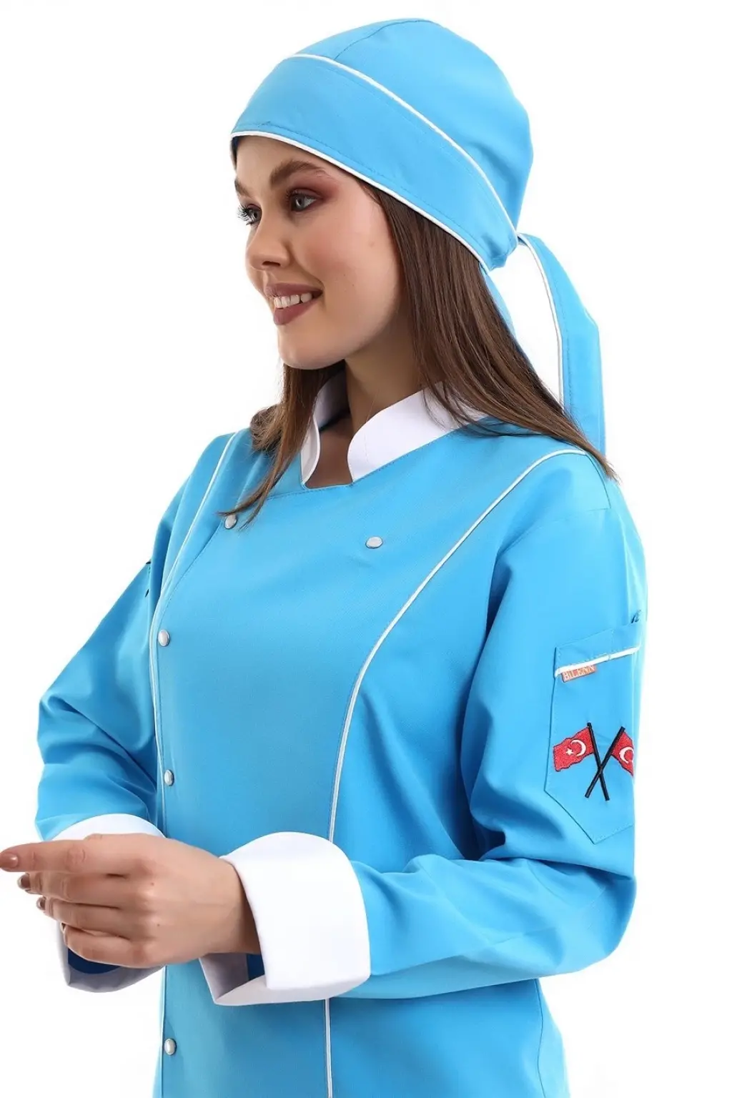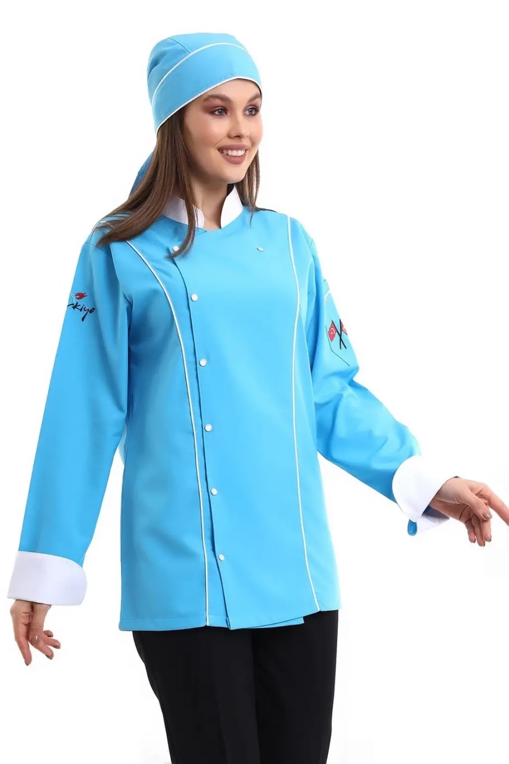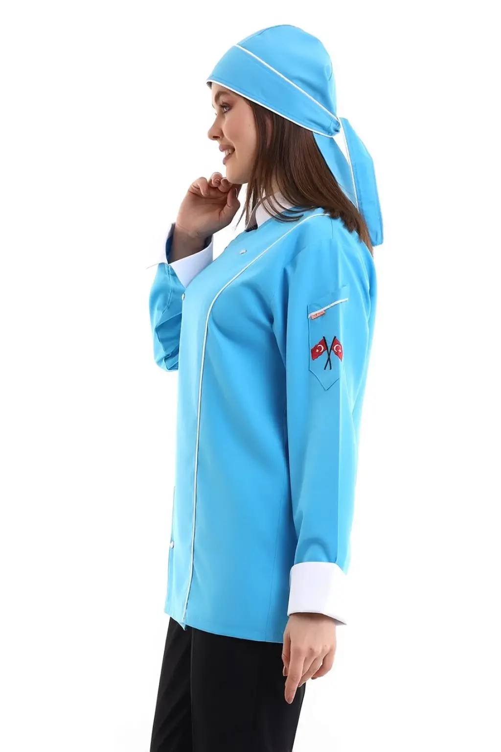 Kadın Aşçı Ceket 01 - Turkuaz Beyaz Biye