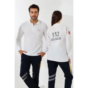 112 Acil Sağlık Yakalı Tshirt Uzun Kol Baskılı - Beyaz